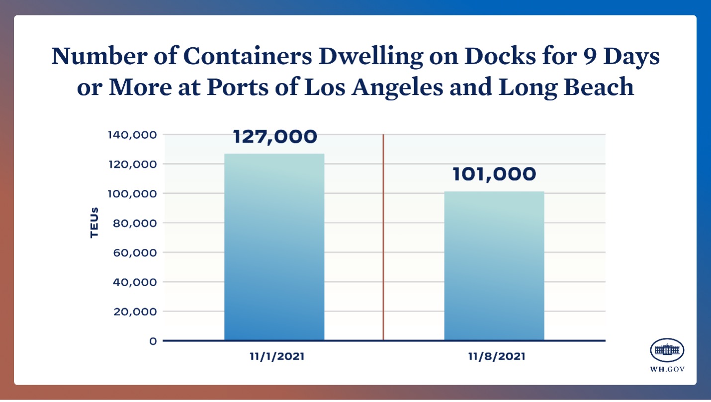 The progress over the last couple weeks means that a goods movement system that has been working in overtime is also starting to function more efficiently, making it easier to get goods from ship to shelf to your front door, as well as help exporters get their goods to market. But we cannot lose sight of the fact that we have underinvested in this system for decades. That is why the recent passage of the Bipartisan Infrastructure Deal is so important. Not only does it include $17 billion for our ports, but it also will help improve efficiency, reduce costs, and decrease emissions in the movement of goods from dock to rail and rail to truck. And this comes on top of a $5 billion agreement between the U.S. Department of Transportation and the state of California to support port and inland improvements in this critical freight node. Altogether these investments will create good paying jobs and help strengthen U.S. competitiveness for decades to come, making our supply chains more resilient against future shocks.