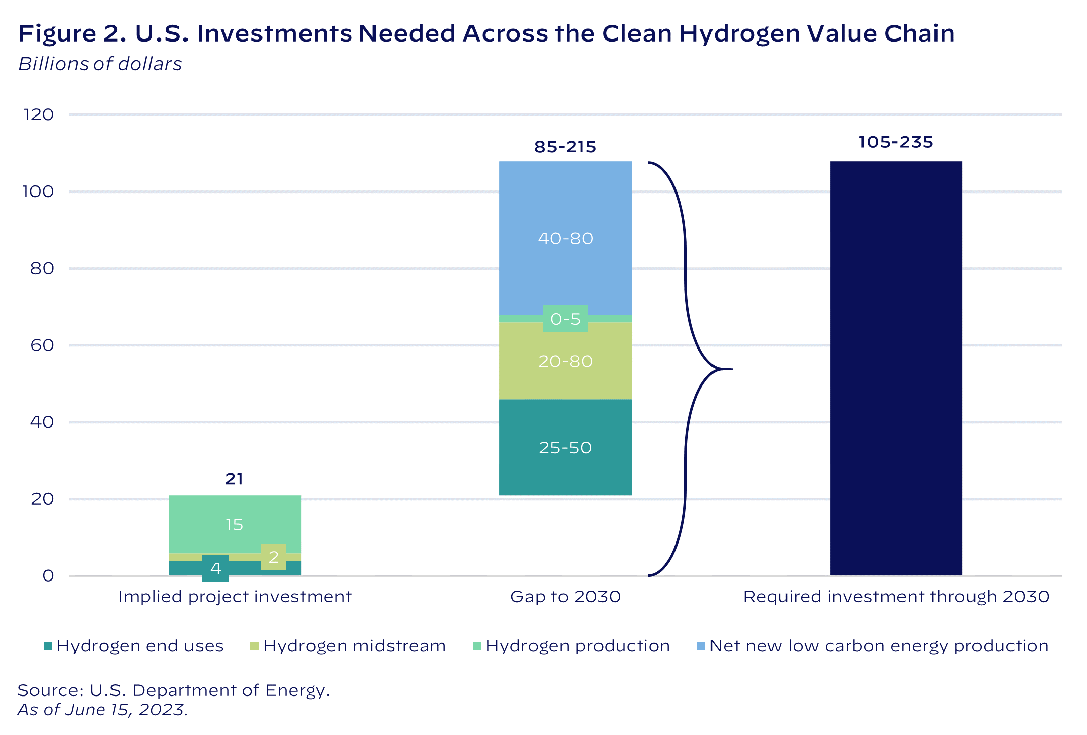 For example, the clean hydrogen report outlines that in the United States, $105–235 billion of investments are needed between now and 2030 to reach the U.S. goal of producing 10 million metric tons per year of clean hydrogen in 2030 (Figure 2). These investments will be spread along the value chain, with roughly half for midstream and end-use infrastructure. As of January 2023, already announced projects represent $21 billion in planned investment, leaving an investment gap of $85-$215 billion that are still required across the hydrogen value chain, including for midstream infrastructure (distribution and storage) and end-use applications (e.g., steel, chemicals, refining).