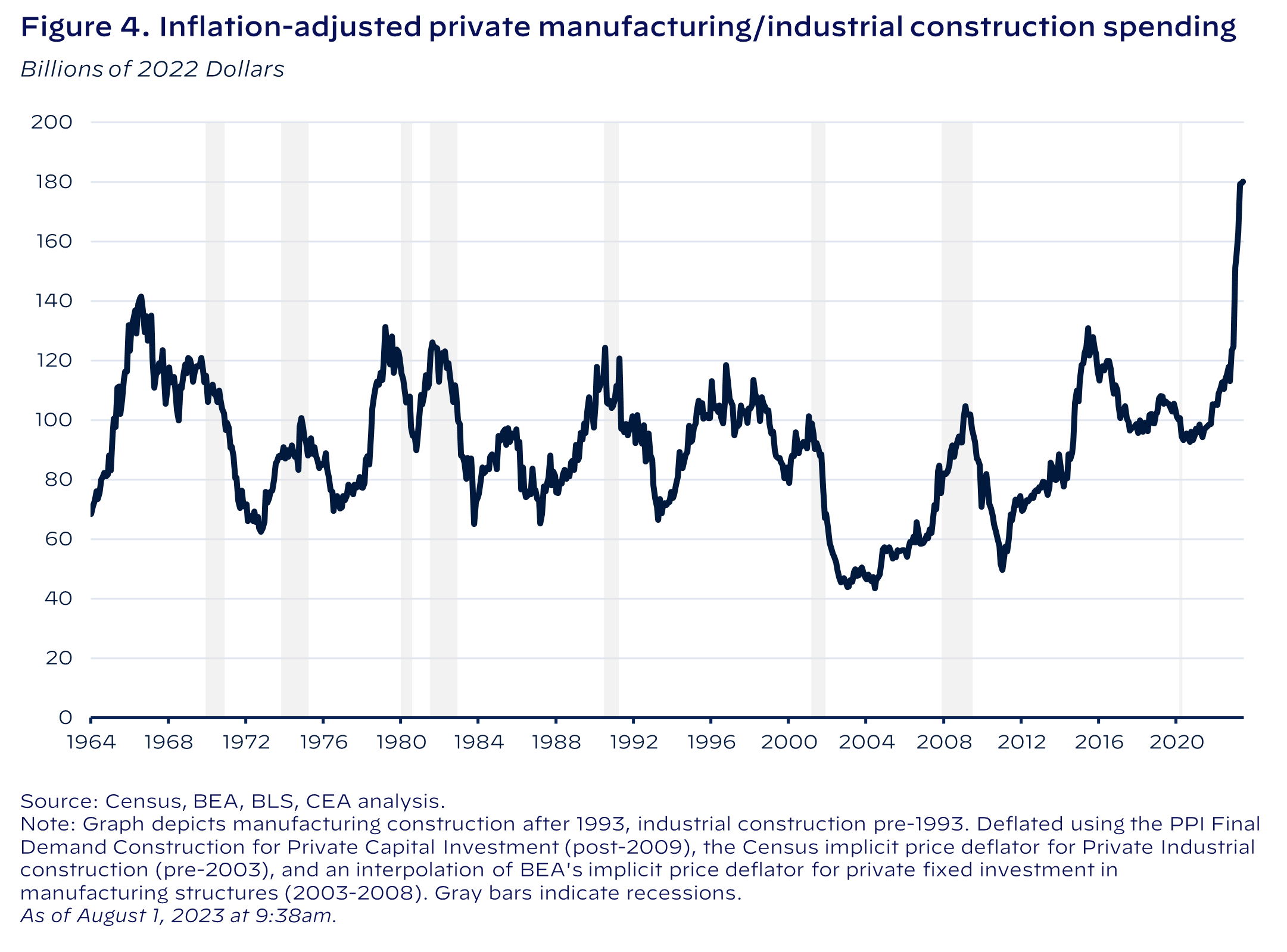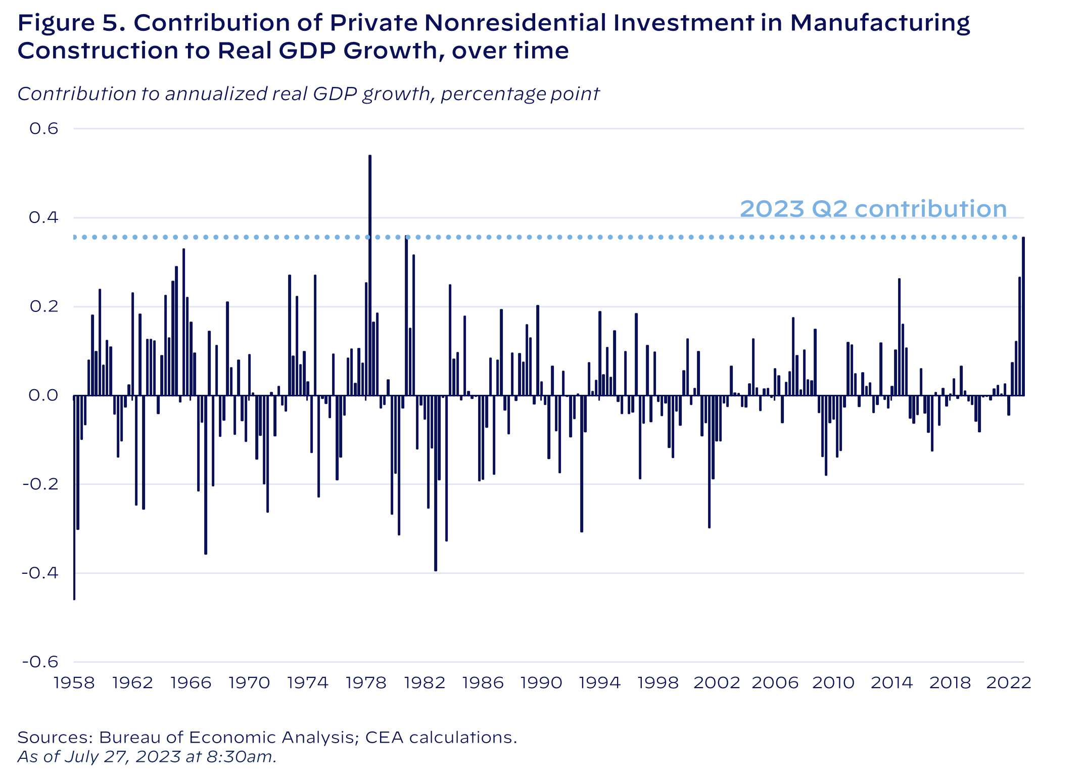Preliminary data suggest that GDP growth is increasingly composed of growth in manufacturing construction. In the second quarter of 2023, private investment in manufacturing construction contributed nearly 0.4 p.p. to real GDP growth according to the Bureau of Economic Analysis’ Advance Estimate (Figure 5). This contribution amounted to the largest contribution of investment in manufacturing structures to real GDP growth in more than 40 years.