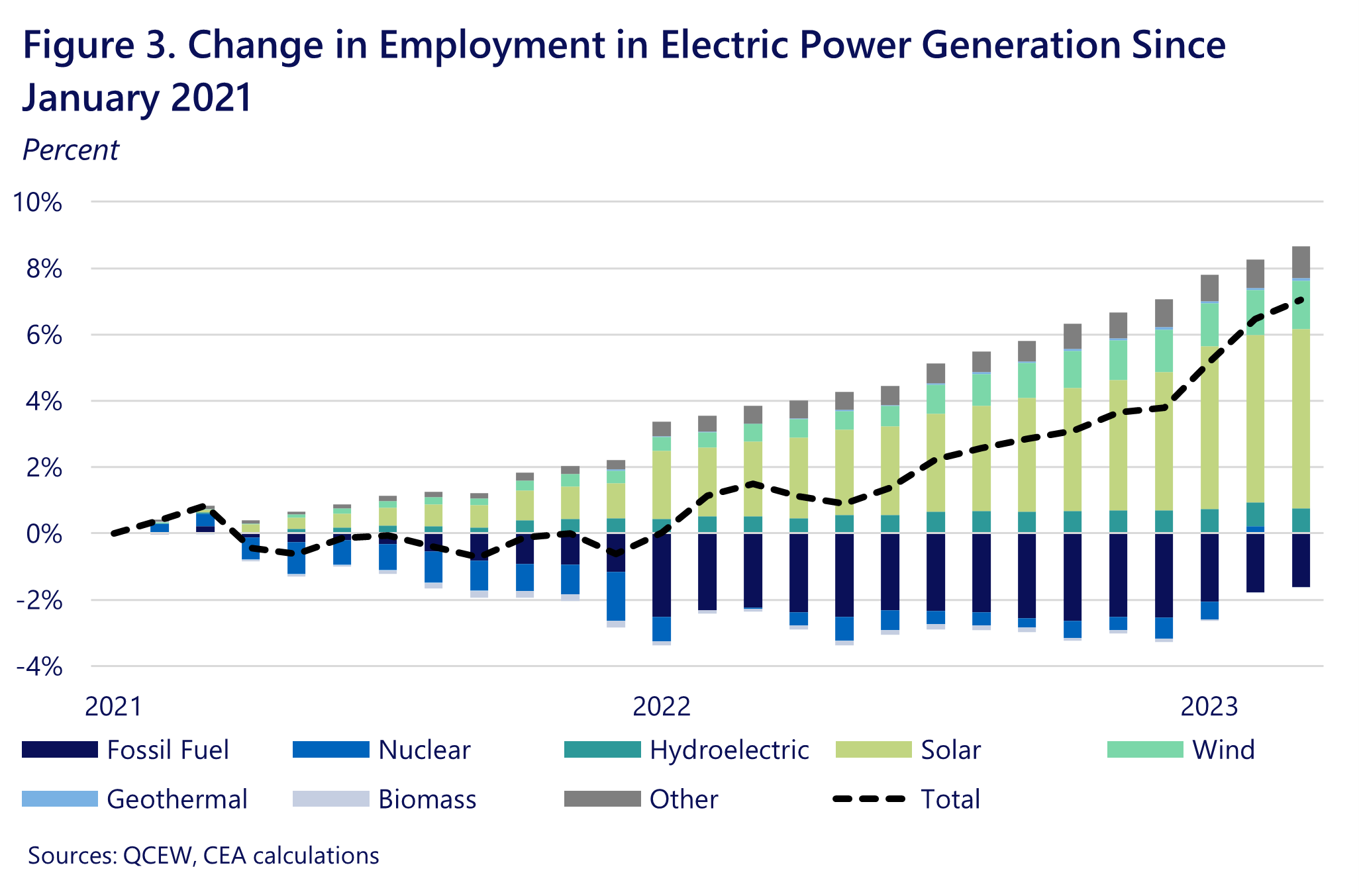 These job gains were driven by increased employment in electricity transmission and distribution and increased clean electric power generation. Between January 2021 and March 2023, the economy added 11,000 jobs in electric power transmission and distribution, 8,000 jobs in solar power generation, 2,000 jobs in wind power, and 1,000 jobs in hydroelectric power. Figure 3 depicts the percent change in employment in power generation, disaggregated by generation technology.