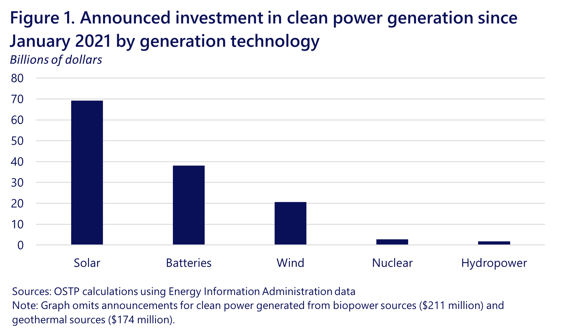 Strong investment in clean power generation and supply is critical to meeting President Biden’s goals of building the clean energy economy with high-quality job opportunities for American workers and addressing the climate crisis. Since the start of the Biden-Harris Administration, private companies have announced plans for about 94 GW of new clean power generation projects, representing an estimated $133 billion in investment as of August 2023 (Figure 1).[1] These announced investments in specific generation projects are a subset of a larger boom across American clean energy supply chains, including more than $70 billion of new investments in clean energy manufacturing and infrastructure.