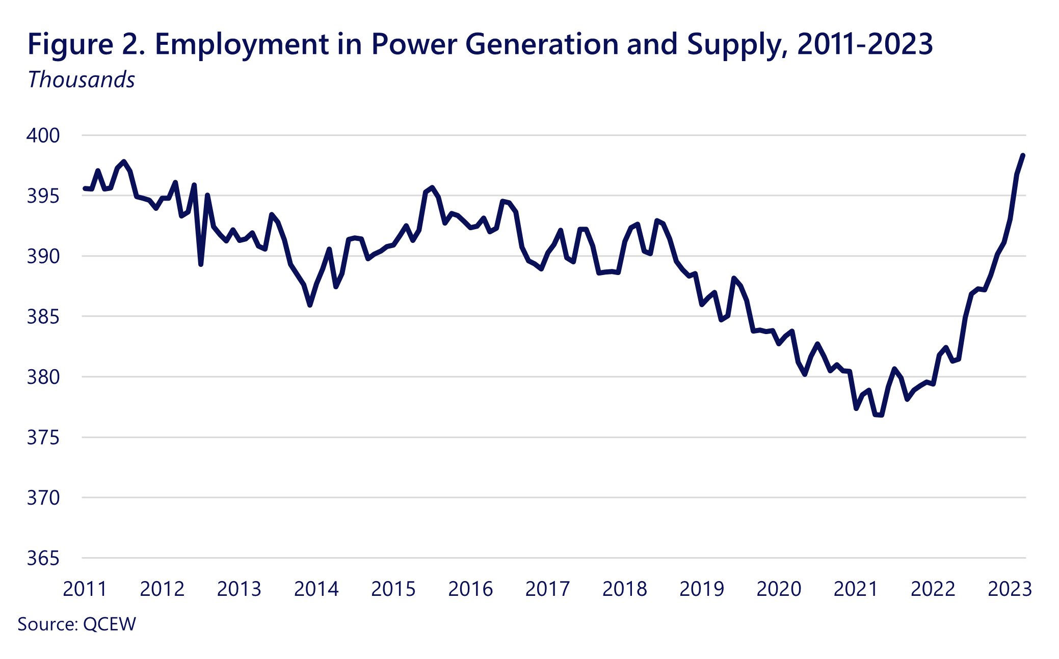 These investments have spurred strong job growth. Between January 2021 and March 2023, the economy added 21,000 jobs in power generation and supply, reaching its highest level in more than a decade following a prolonged decline in employment in the industry (Figure 2).[2] Notably, more than half of these job gains occurred between August 2022 (when the Inflation Reduction Act and the CHIPS and Science Act—critical pieces of the President’s Investing in America agenda—were signed into law) and March 2023.