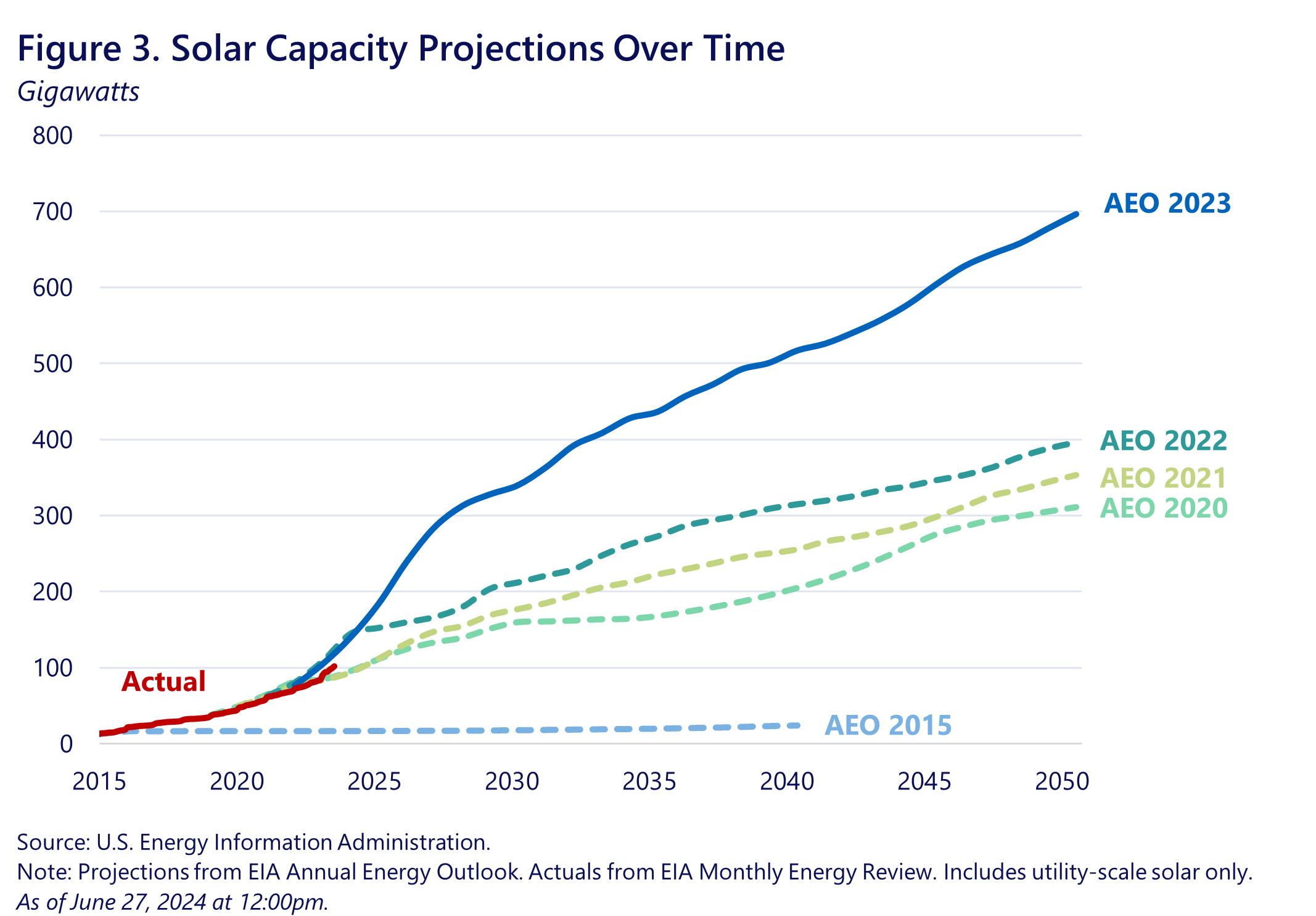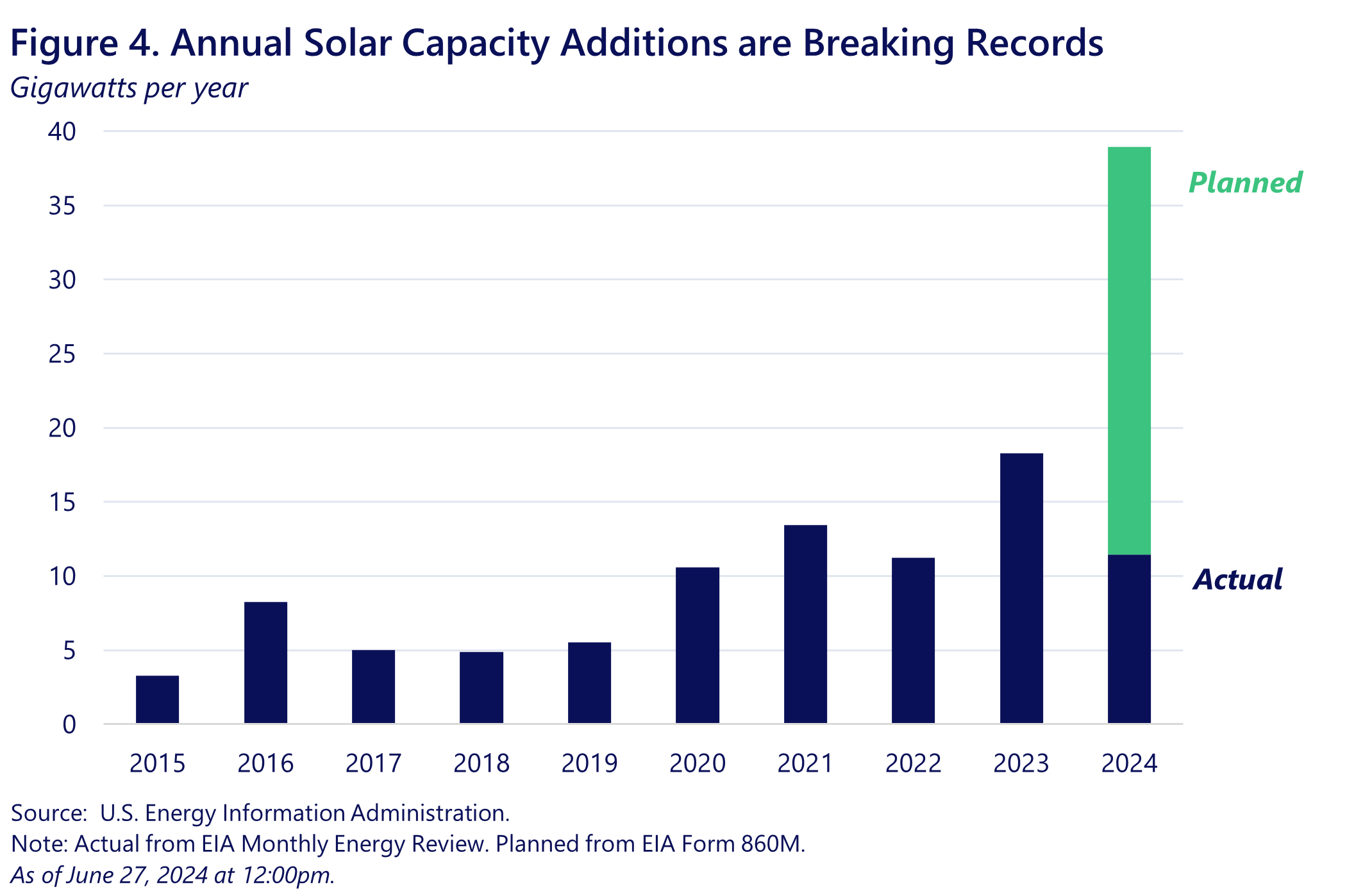 As the manufacturing base expands, solar and wind deployment are projected to grow rapidly—considerably faster than projections before the Investing in America agenda was signed into law. According to the latest Annual Energy Outlook (AEO) forecast[1] from the U.S. Energy Information Administration, the United States is on track to have about 340 gigawatts of solar capacity by 2030—nearly twice the capacity forecasted in the beginning of 2021 (Figure 3).[2] Already, from the beginning of the Administration through May 2024, installed solar capacity on the grid has more than doubled. In 2023, the United States added more utility-scale solar to the grid than ever before in history—and in 2024, planned projects are expected to more than double last year’s record (Figure 4).