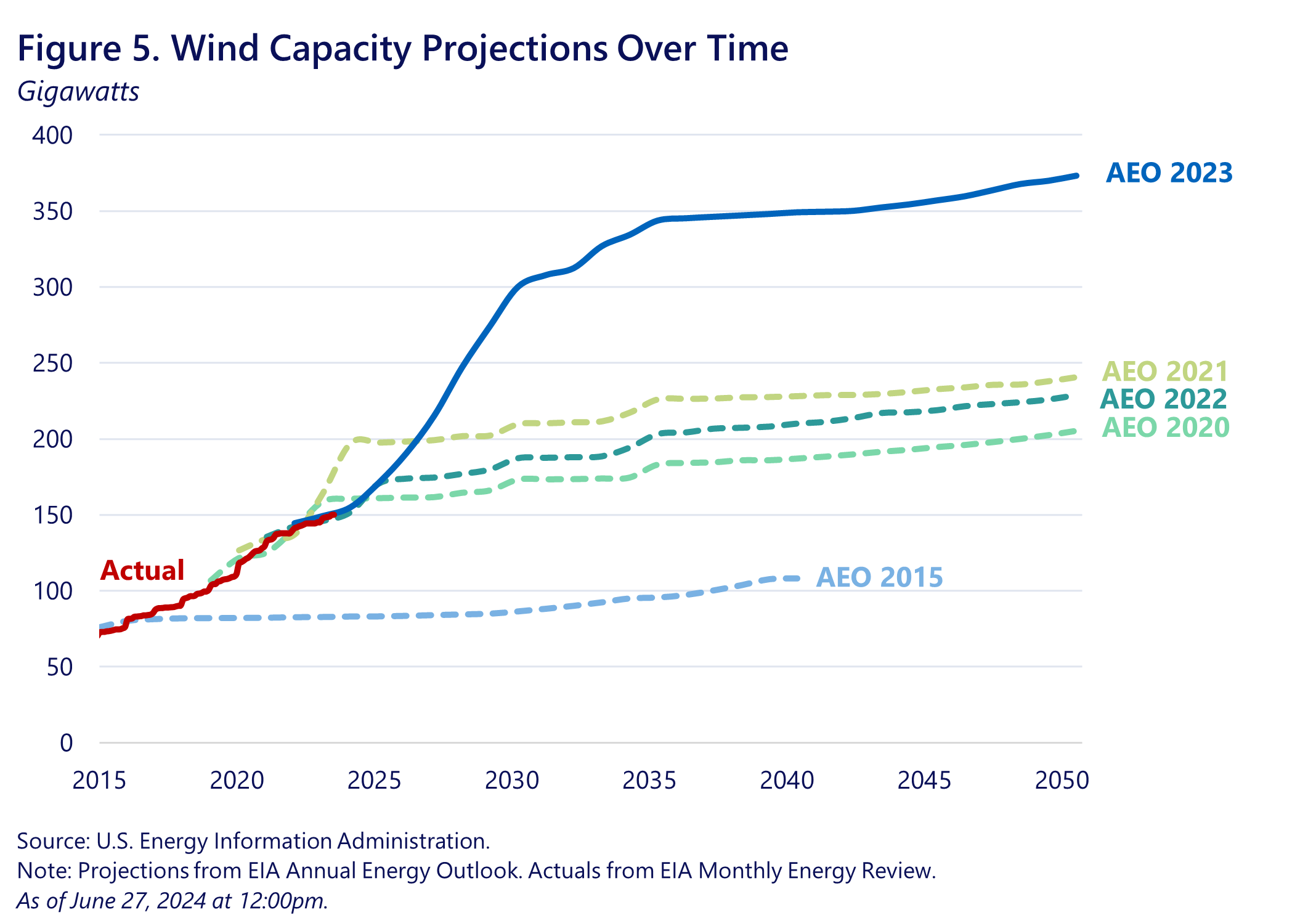 Likewise, for wind energy capacity, the latest AEO forecast estimates that the United States will have about 300 gigawatts of wind capacity by 2030, a 43 percent increase from the 2021 projection (Figure 5). For context, this estimated capacity from solar and wind in 2030 would be roughly double the total existing renewable capacity on the grid at the end of 2022.
