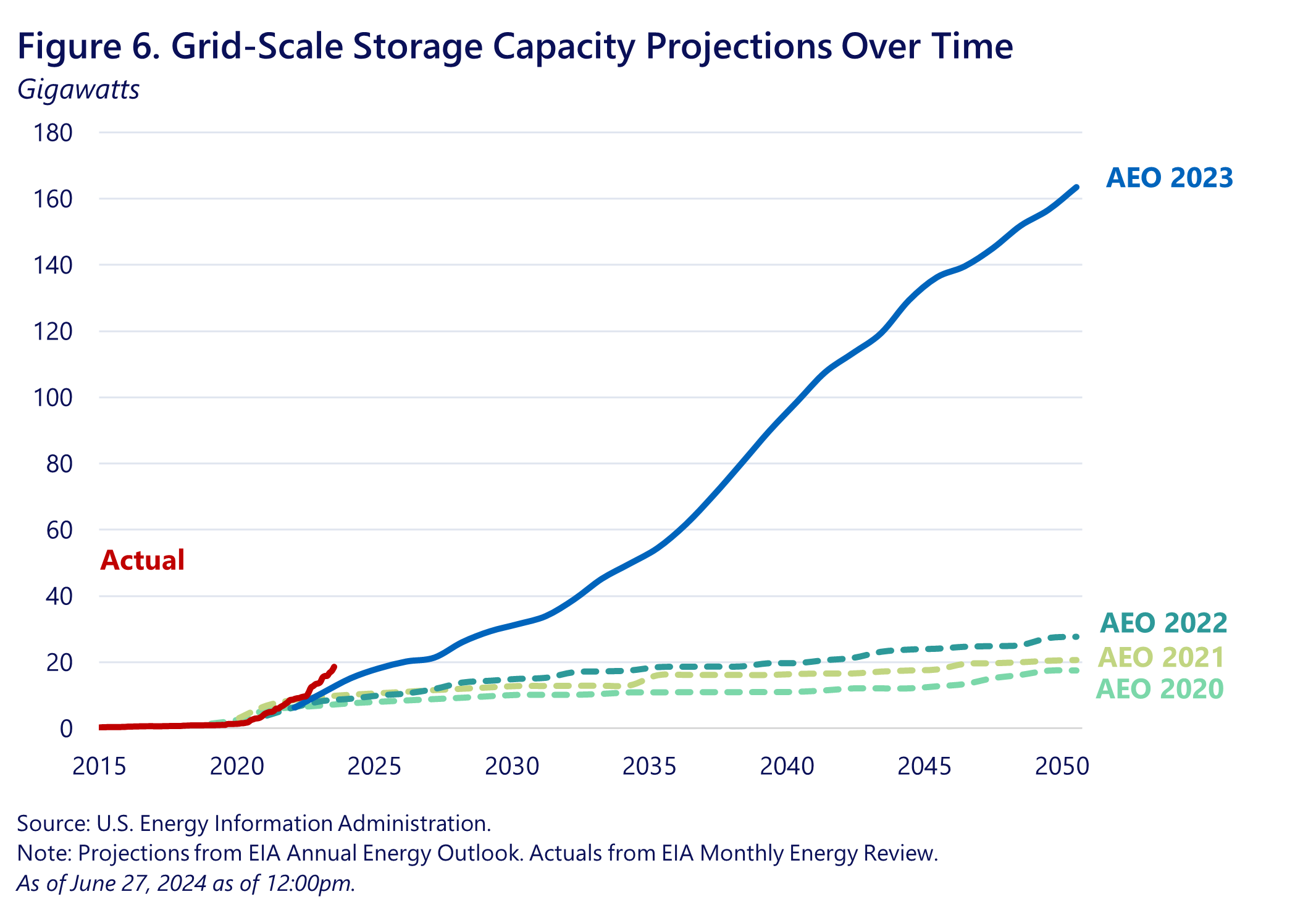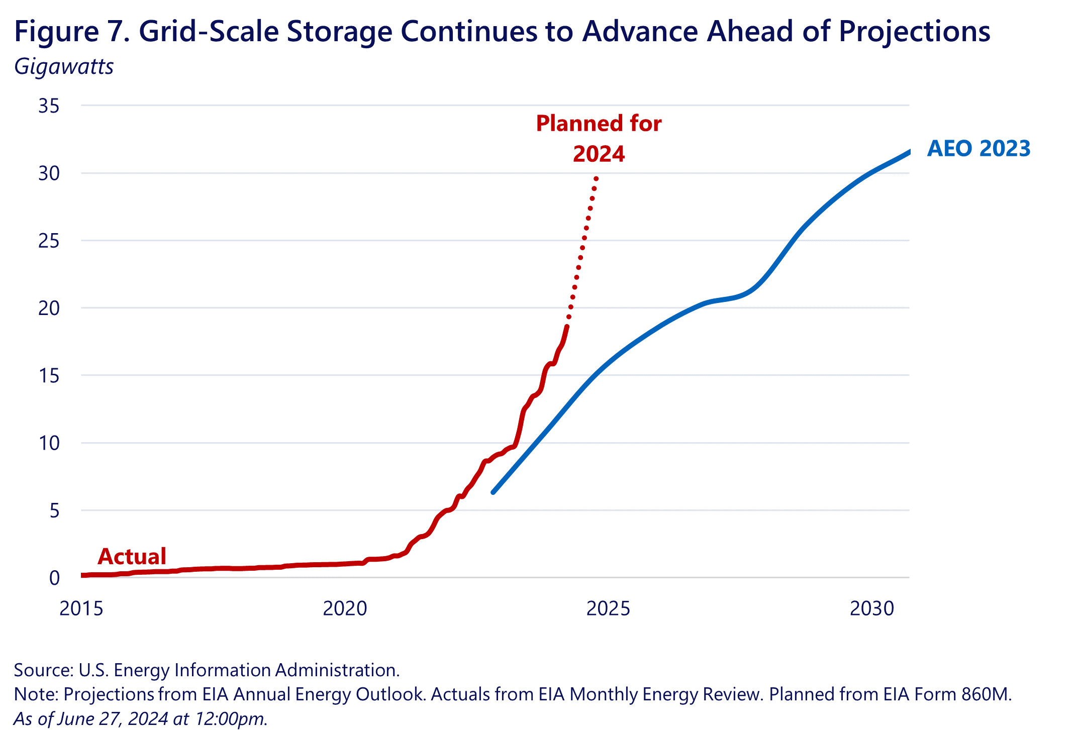 Incentives from the President’s Investing in America agenda are spurring historic deployment of large-scale energy storage capacity. Following the passage of the Bipartisan Infrastructure Law and the Inflation Reduction Act, forecasts show a dramatic expansion in expected storage capacity, far outpacing previous estimates (Figure 6). Further, deployment is already ahead of even the latest forecasts. Storage capacity had increased nearly twelve-fold since the beginning of the Administration, and, at the end of 2023, capacity was over 40 percent higher than the 2023 forecast. Deployment is expected to advance even further ahead of the forecast in 2024—about double the expected deployment—if all planned projects come online. This would also represent a near doubling of the total storage capacity on the grid (Figure 7).