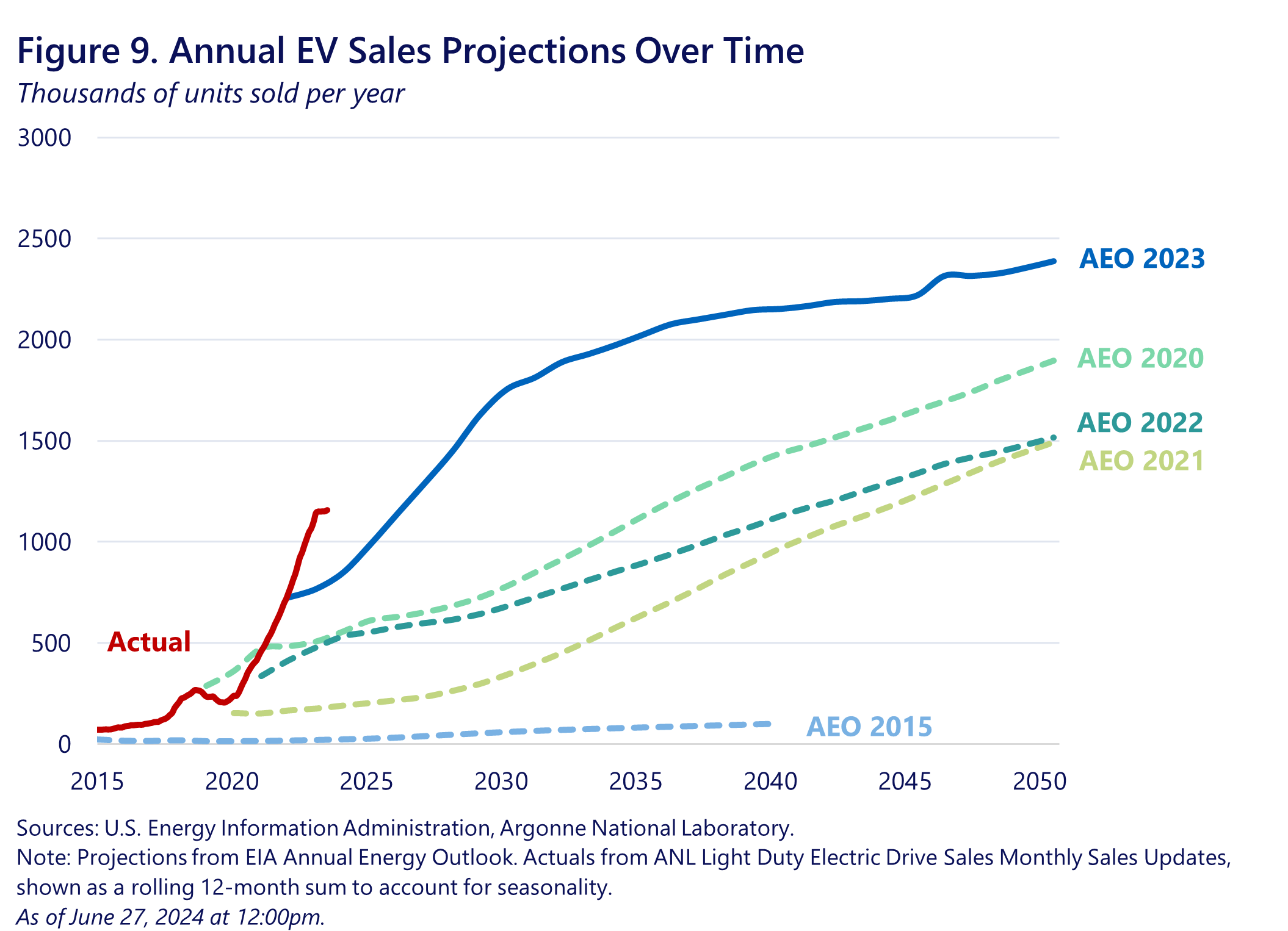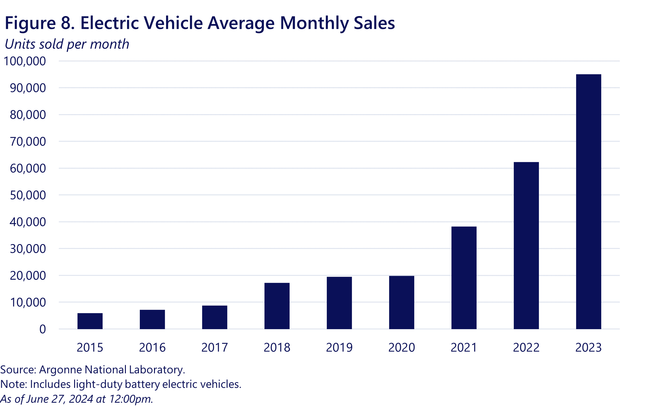 EV sales have risen rapidly during this period, from roughly 20,000 sales per month in 2019 and 2020, to over 95,000 per month in 2023 (Figure 8)—a nearly five-fold increase. At the start of 2023, forecasters estimated that beginning in 2026, more than one million EVs would be sold each year, and by 2030, nearly 1.8 million EVs would be sold—more than five times the forecast in 2021 (Figure 9). Actual sales have surpassed these forecasts. More than one million EVs were sold in 2023—three years ahead of the projections made earlier this year and 18 years ahead of the projections made in the beginning of 2021.