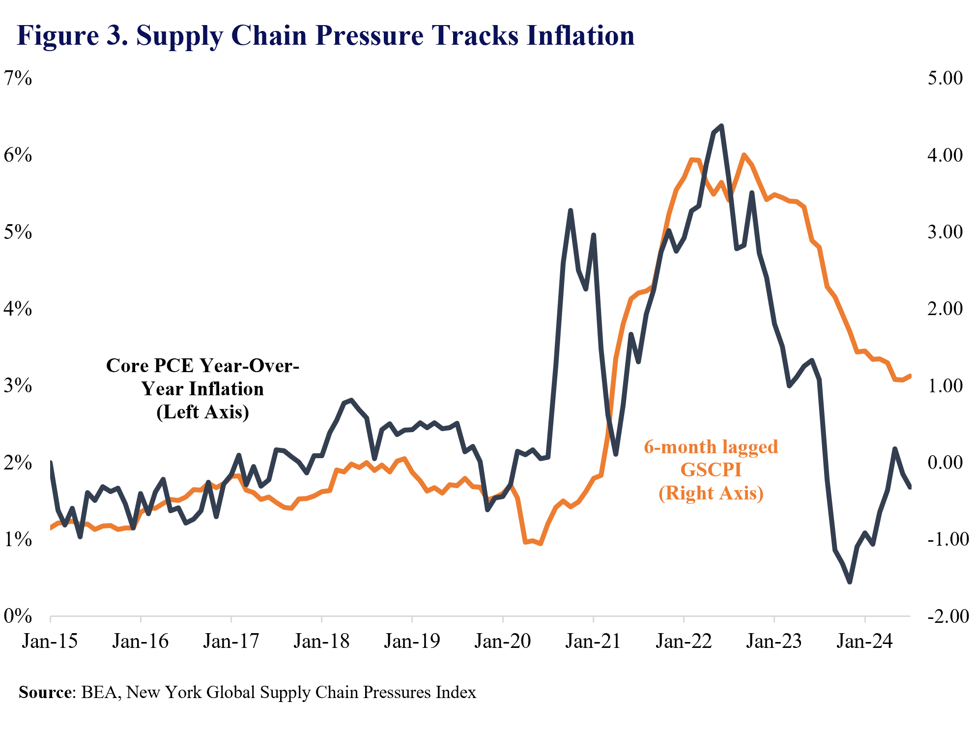 At the sectoral level, it is now clear that price increases were concentrated in the sectors that had lower or even negative output growth between 2021 and 2023. This is what we’d expect to find if supply shocks, rather than overall excess demand, were the major driver of inflation. And this is corroborated at the aggregate level, where supply chain disruptions spiked and then moved back down to pre-pandemic levels, and inflation followed the same pattern with a lag, as we can see in Figure 3.