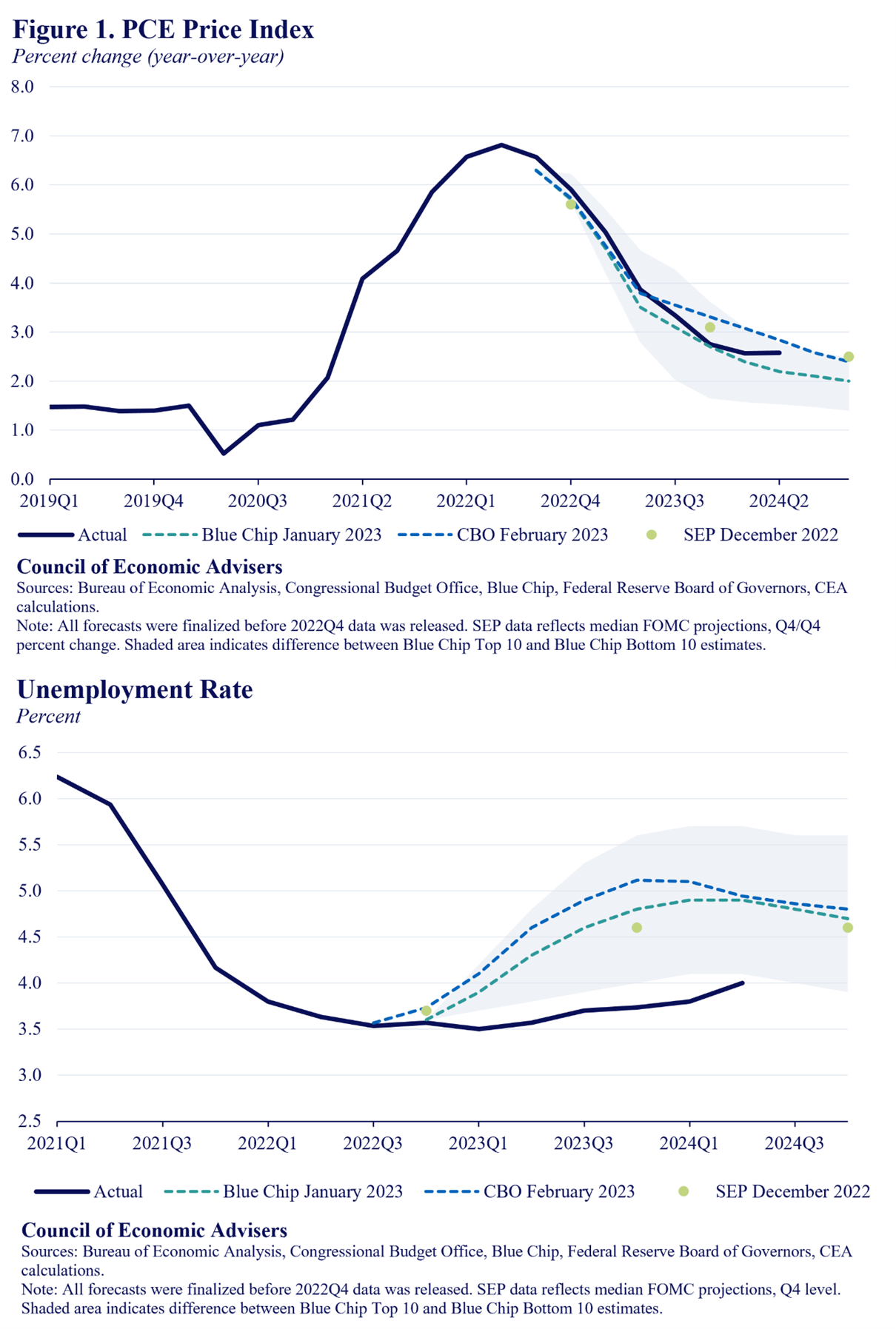 In short, the US economy achieved better unemployment and growth outcomes than predicted 2 years ago, while inflation came down in line with forecasts, as shown in Figure 1. The fact that inflation came down while employment continued to expand provides good evidence that the inflation surge was associated with several overlapping shocks associated with the pandemic and Russia’s invasion of Ukraine that dissipated over time.