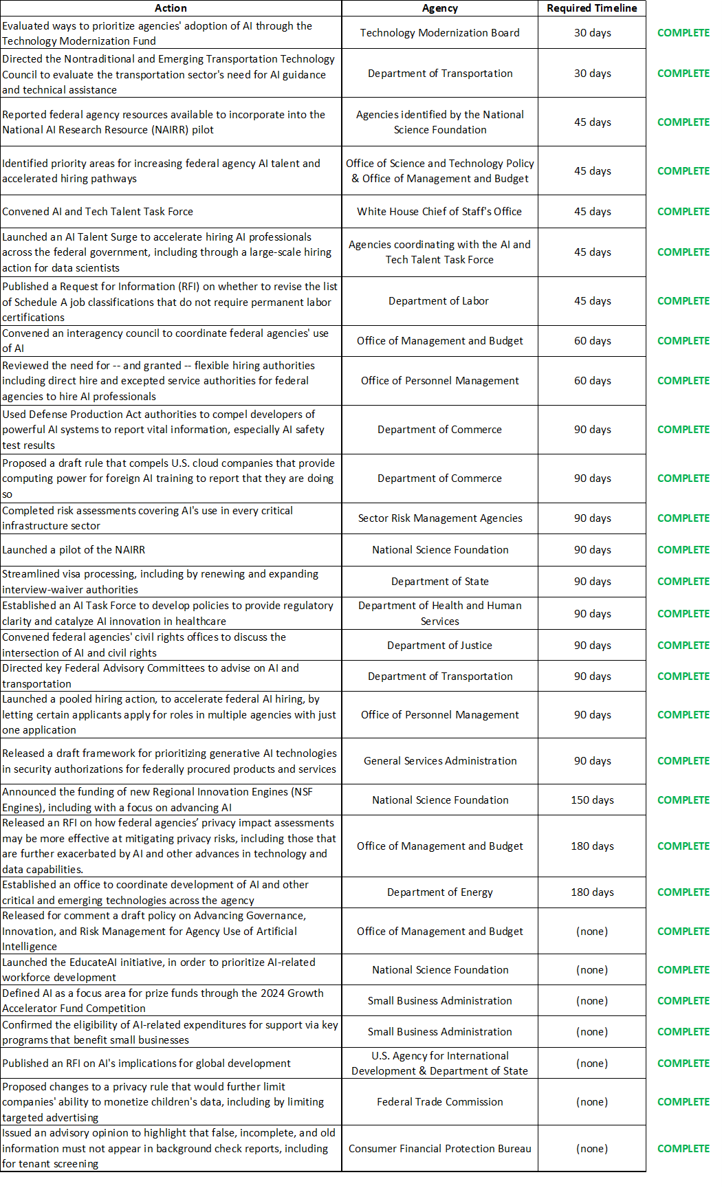 The table below summarizes many of the activities federal agencies have completed in response to the Executive Order.