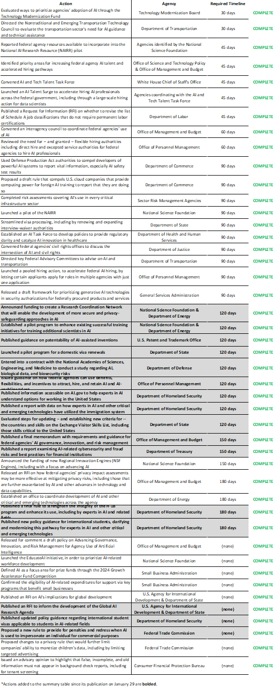 It also delivers on a major milestone 150 days since the release of Executive Order 14110, and the table below presents an updated summary of many of the activities federal agencies have completed in response to the Executive Order.