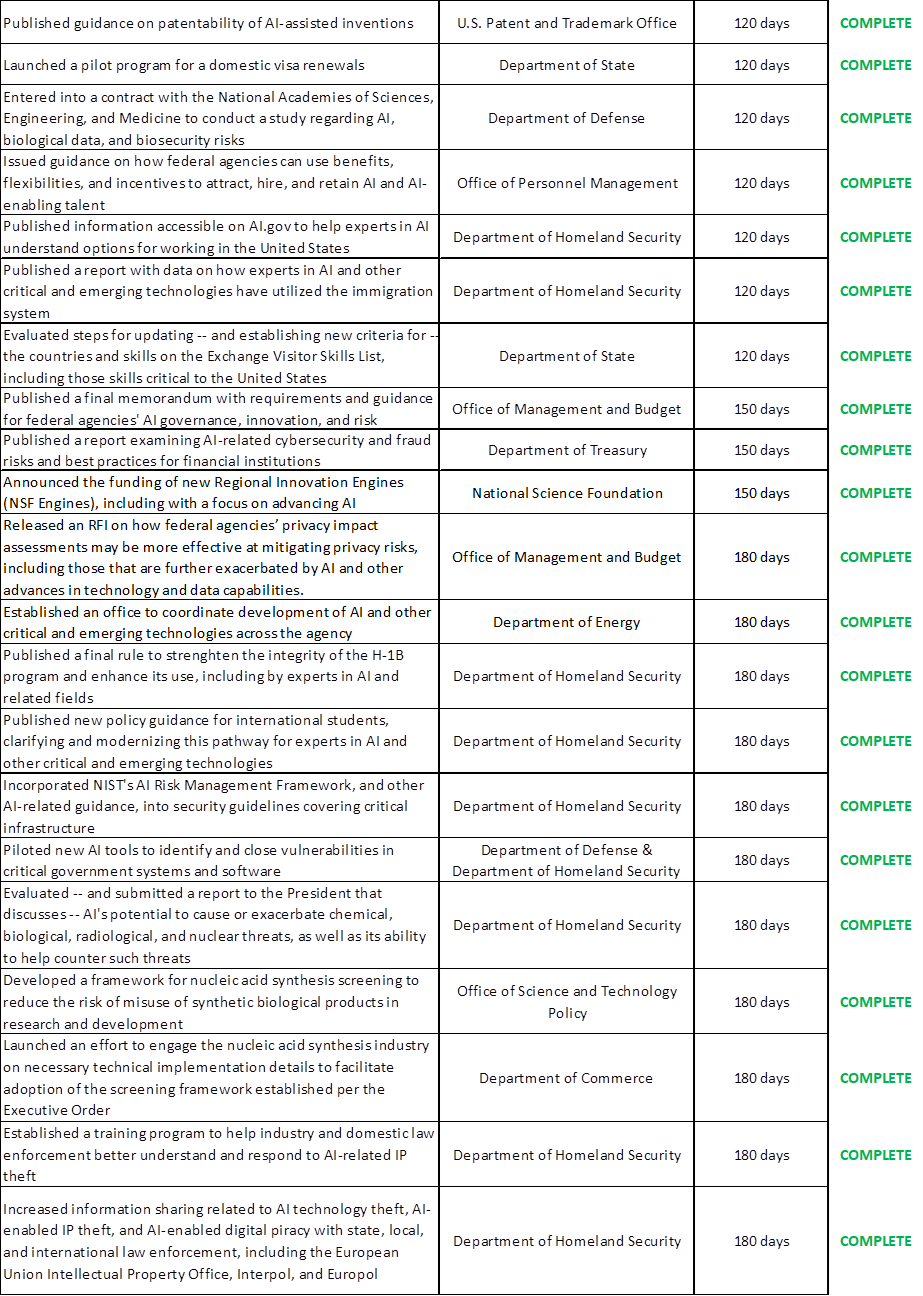 The table below summarizes many of the activities that federal agencies have completed in response to the Executive Order.