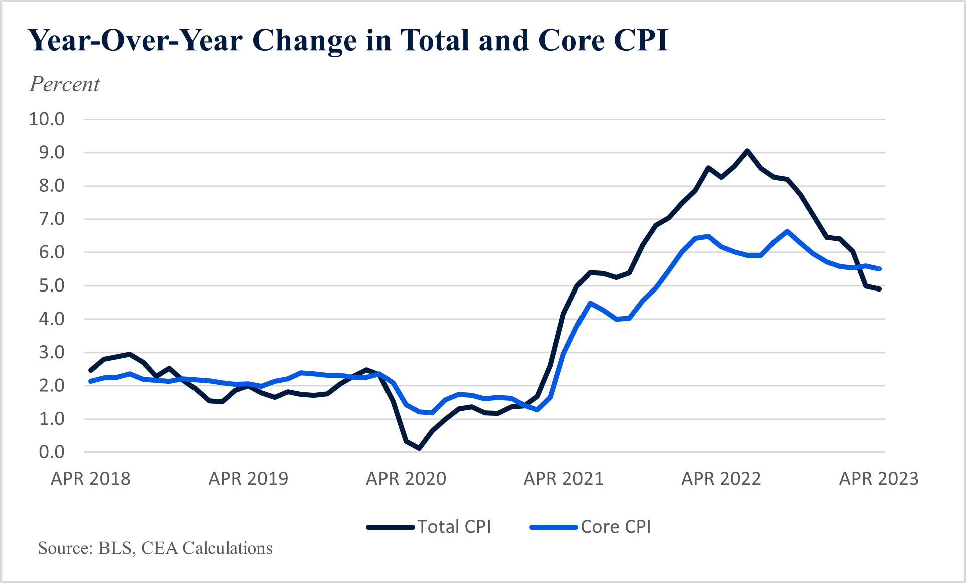In a recent blog, we discussed the importance of different measurement approaches to pulling the economic signal from noisy monthly jobs data. In this post, we do the same for monthly CPI inflation. Typically, inflation reports and their media coverage focus on two numbers: the monthly change and the yearly change. This morning we learned, for example, the April inflation was 0.4 percent since March and 4.9 percent since last April. As the figure below shows, yearly inflation has declined since its most recent peak in June of last year, when it was 9.1 percent. The fact that the yearly rate has come down 10 months in a row and is down 4.2 percentage points from this peak is a good sign that we are headed solidly in the right direction, though price growth is still clearly elevated relative to pre-pandemic levels.
