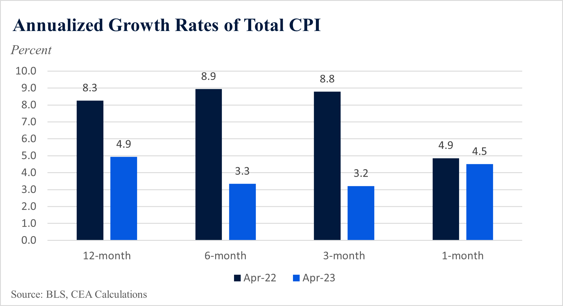 Starting with the bars from today’s data, we see smaller growth rates at 6- and 3-month intervals than at the yearly (12-month) interval, suggesting inflation has slowed in recent months. However, the one-month rate (today’s 0.4 percent, annualized) jumps up a bit, a reminder that the noisier monthly data can be harder to read, trend-wise. The figure also shows that CPI inflation is a lot lower at least at the 12, 6, and 3-month intervals this April than it was in April 2022.