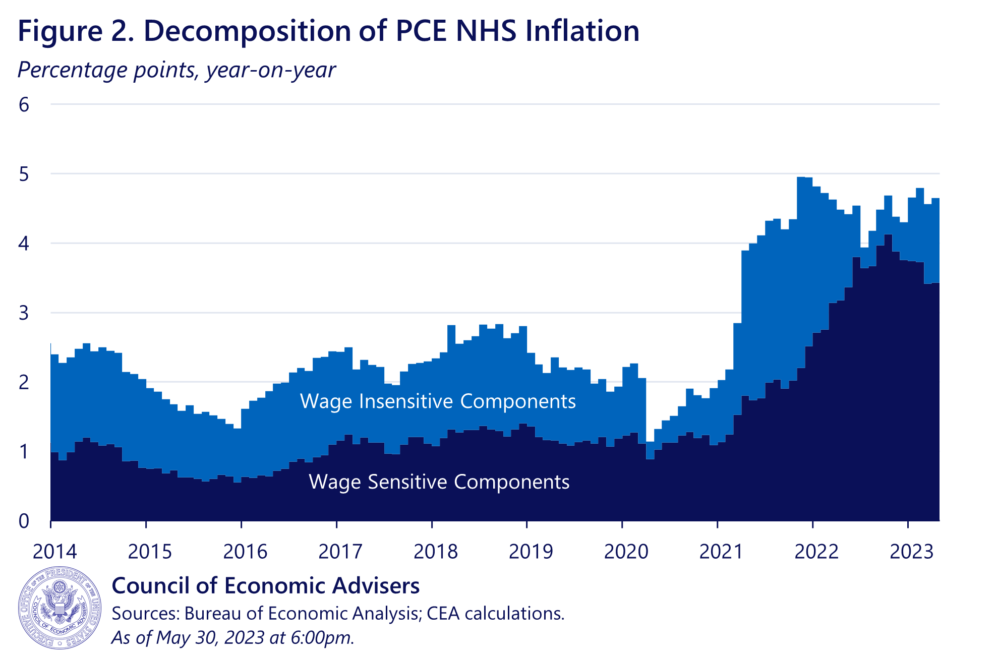 Identifying the wage sensitivity of NHS inflation is complicated by the fact that this inflation component reflects a motley blend of industries that are not uniformly labor-intensive: restaurants, airlines, hospitals, casinos, nonprofits, banks, law firms, etc. To overcome this hurdle, the CEA individually modeled the wage sensitivity of more than 100 detailed NHS PCE component indices. The methodological appendix has further detail, but in brief, we identified “wage-sensitive” NHS components using a quarterly Phillips Curve model with controls for NHS AHE wage growth,[1] as well as expectations and supply factors. Components with positive and significant estimated coefficients on wages were classified as “wage sensitive,” while all other components were “wage insensitive.” Of the 111 detailed indices the CEA examined, 55 were designed as wage sensitive, representing 56 percent of nominal NHS expenditures. Note that this approach is agnostic as to why a component is wage sensitive, e.g., due to rising labor costs, higher pass-through, relatively stronger demand, or something else entirely.