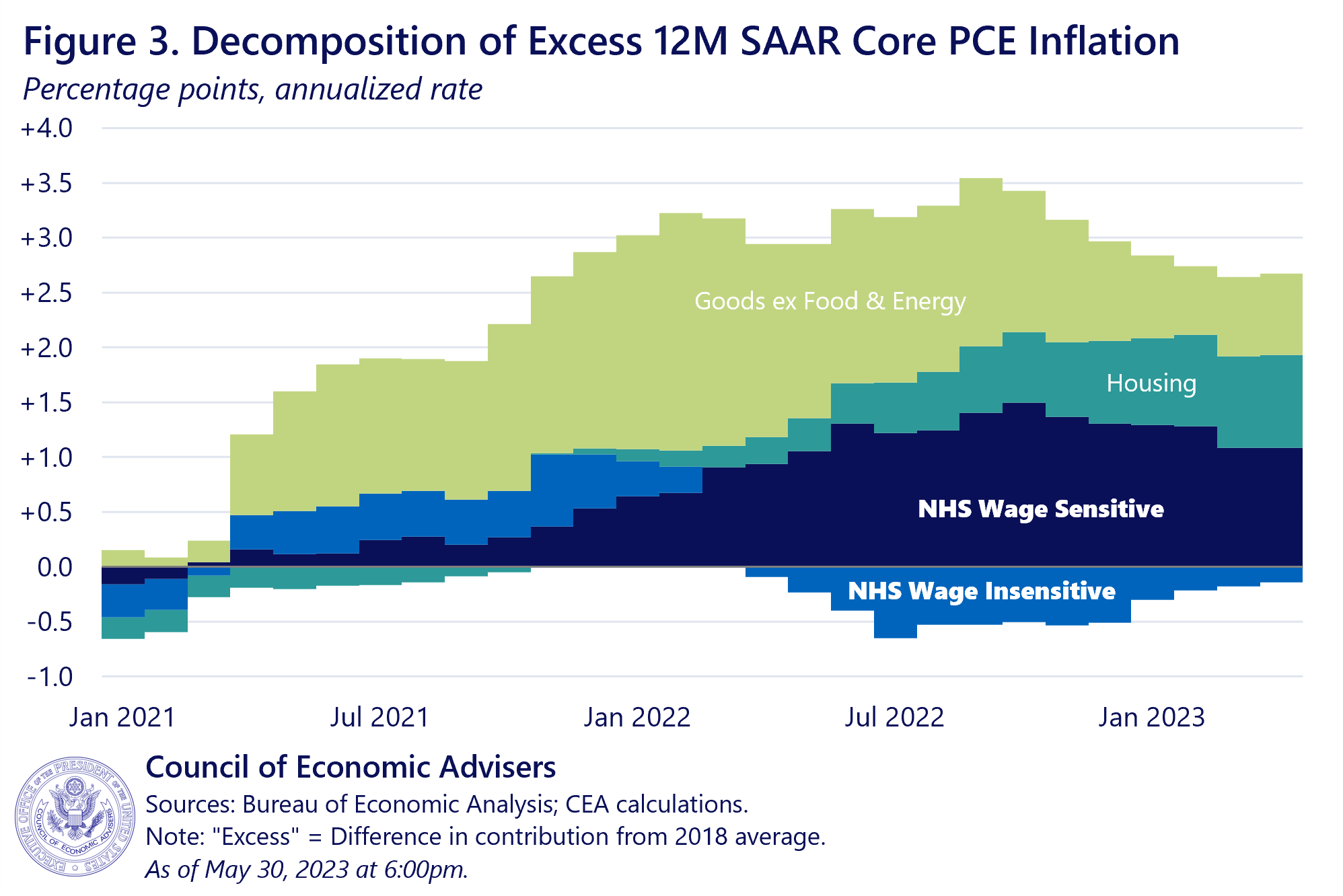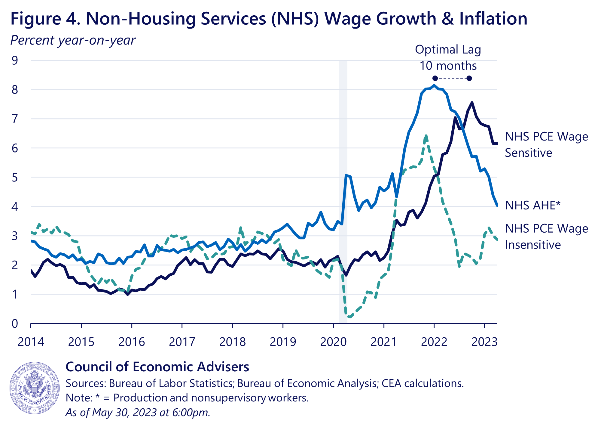 In conclusion, the CEA finds that wage-sensitive components of NHS inflation make up just over half of NHS PCE consumption but explain more than all of the excess NHS inflation over the last year relative to prepandemic target. Price inflation in the wage-sensitive sectors of NHS lags wage growth in those sectors by around 10 months, which, given recent declines in NHS wage growth, suggests the possibility of a slowing in price inflation in those sectors in the months ahead. However, the response of overall NHS inflation is uncertain due to our limited understanding of the dynamics of this diverse sub-index as well as the volatility of wage-insensitive NHS components. We will therefore closely track incoming data to test the validity of this hypothesis.