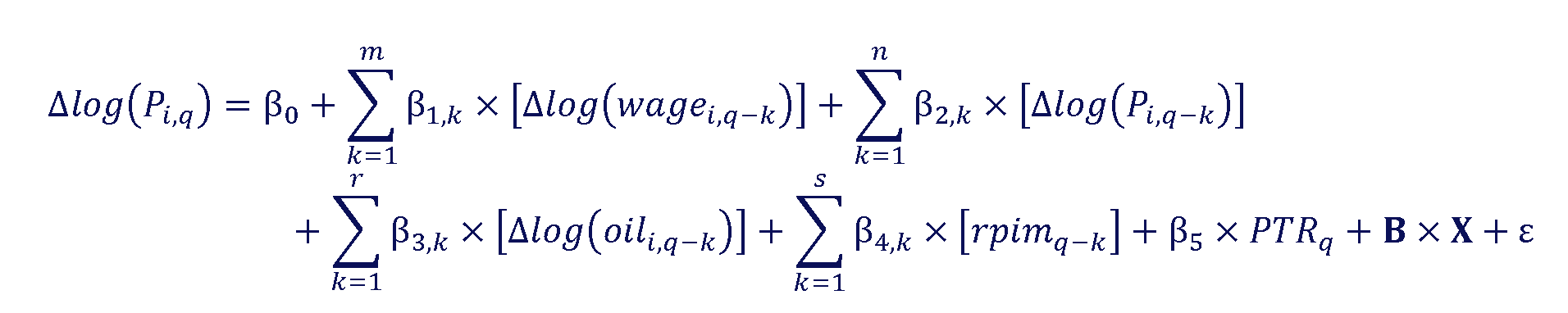 The lags m, n, r, and s are optimized for each Pi to minimize the AIC. The sample runs from 1990 Q1 to 2022 Q4.