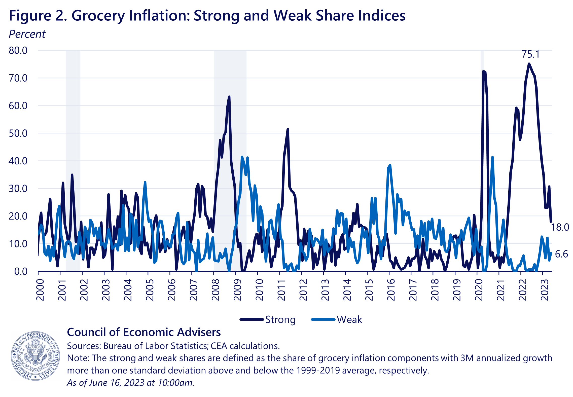 To capture the breadth and intensity of upward or downward pressure on grocery prices, the CEA constructed two measures. The first measure, which we call the Strong Share, is the share of grocery components that have three-month annualized inflation that is more than one standard deviation above their historic means. The second measure, the Weak Share, is the share of components that have three-month annualized inflation that is one standard deviation below their historic means (Figure 2). While still elevated, the Strong Share has dropped to 18 percent from 31 percent last month and its peak of 75 percent in May 2022. Meanwhile, the Weak Share is up slightly to 6.6 percent from 4 percent last month and its low of 0 percent in April 2022. Together, these point to less upward pressure on grocery inflation.