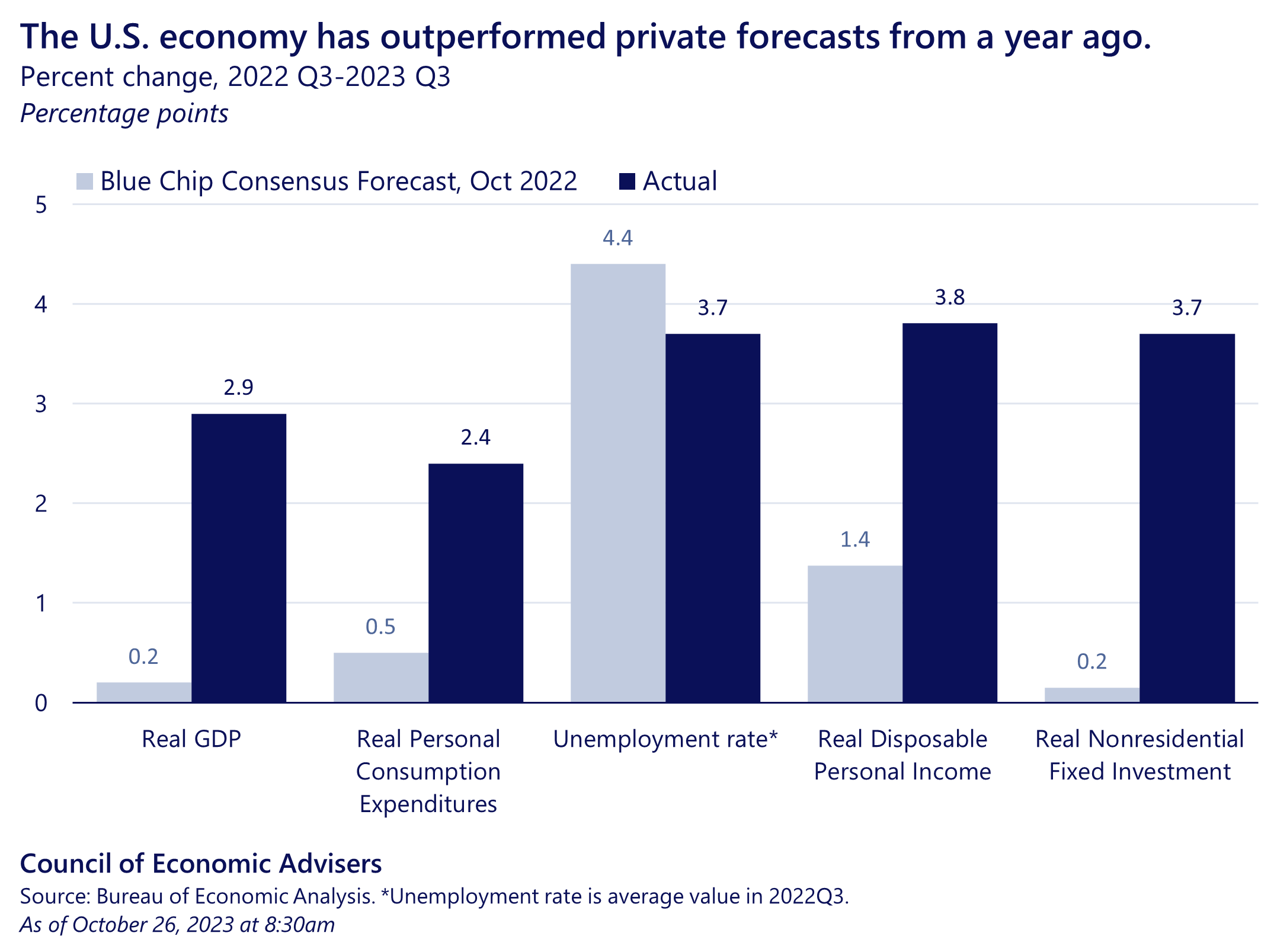 Another important factor boosting GDP growth over the last year has been President Biden’s investment agenda. This has pulled in hundreds of billions in private capital, much of which is going towards building American factories to support clean energy and semiconductor production. Returning to the last set of bars in the first figure up top, private non-residential business investment was far stronger over the last year than expected by forecasters (growth 3.7% versus a forecasted 0.2%).