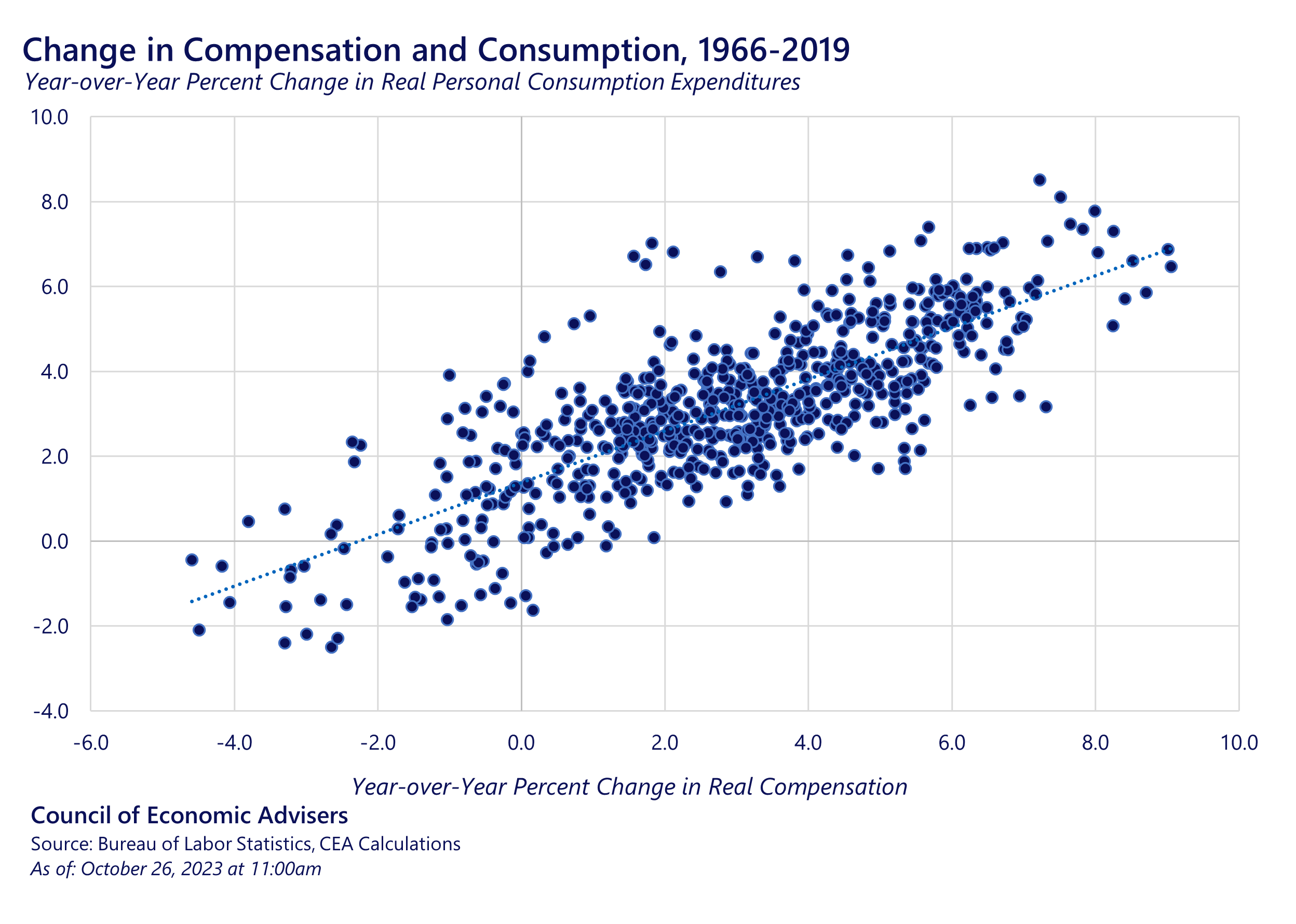 And this is seen very clearly in Figure 2 which shows the tight fit between labor market earnings and consumer spending by plotting the relationship between the year-over-year percent change in aggregate compensation and aggregate spending, adjusted for inflation. The figure uses data from the mid-1960s through 2019 to avoid the sharp disruption to both variables from the pandemic. The correlation of 0.79 quantifies this very simple, but close, relationship, one which roughly predicts that if we continue to see real income gains for workers, we can expect continued healthy growth in consumer spending.