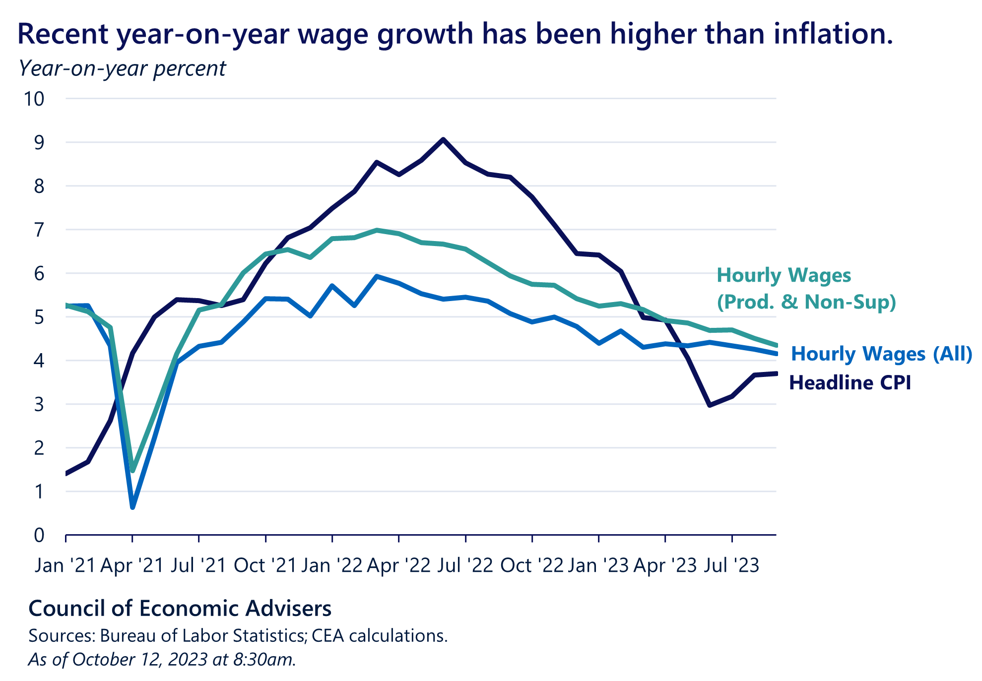 The roughly $11.6 trillion per year in aggregate real compensation received by U.S. workers is a function of both their real hourly compensation and their aggregated hours of work. In this regard, the 14 million jobs created since President Biden took office not only have provided opportunities and greater bargaining clout to working Americans, but also have played a key role in boosting aggregate spending, which drives positive growth outcomes that have led to the correction in the market’s recession calls.