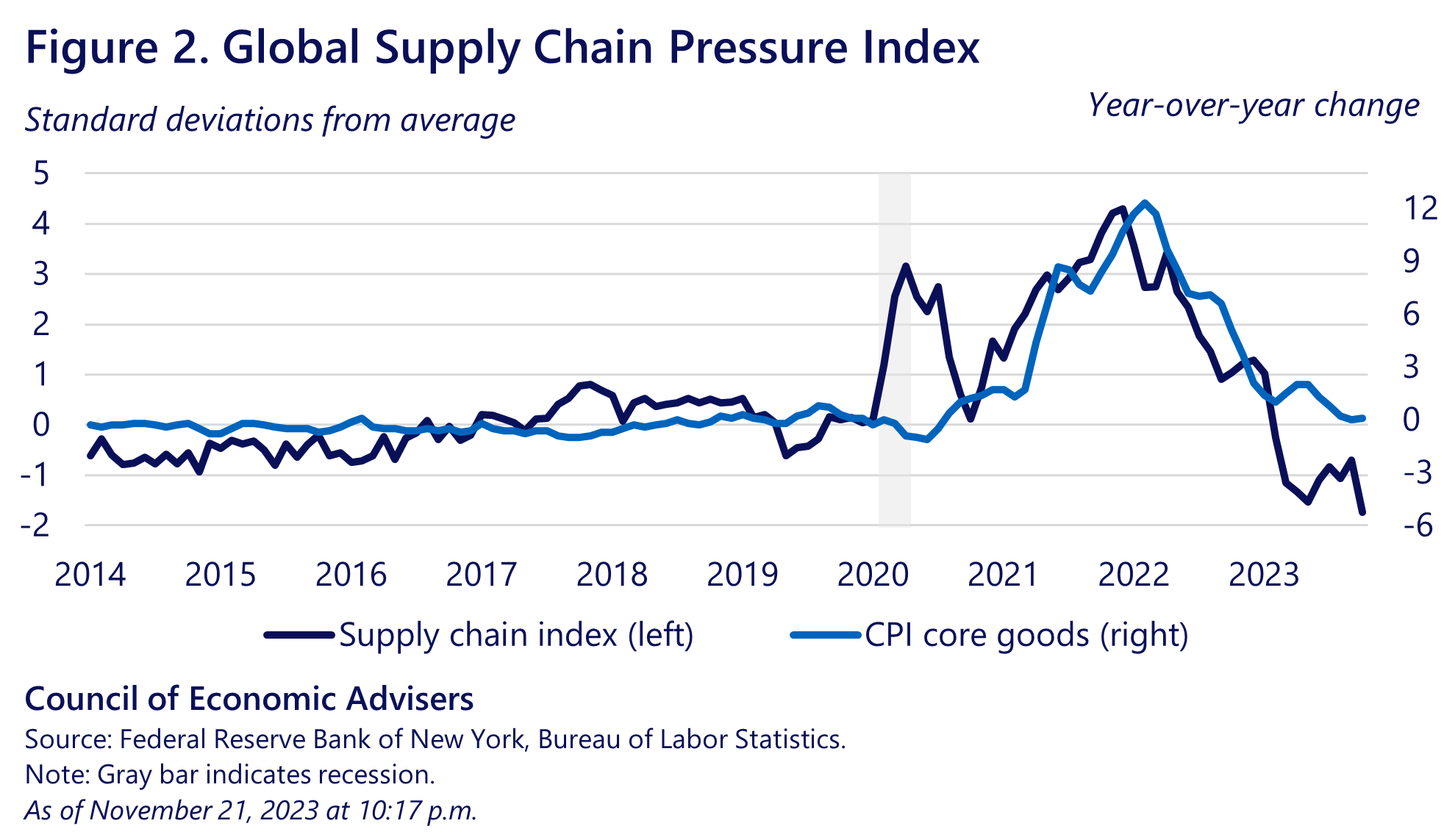 The correlation between supply chains and inflation can be seen in the Global Supply Chain Pressure Index, produced by the Federal Reserve Bank of New York, which tracks both headline and core goods inflation in the United States and the Euro Area (Giovanni et al. 2022; Council of Economic Advisers 2023). As shown in figure 2, the index grew sharply over the first year of the pandemic, reaching its highest-ever recorded value in April 2020, only to rise to an even higher peak by December 2021 (Federal Reserve Bank of New York). Since then, the index has come down significantly. In October 2023, it fell to 1.74 standard deviations below its historical average.