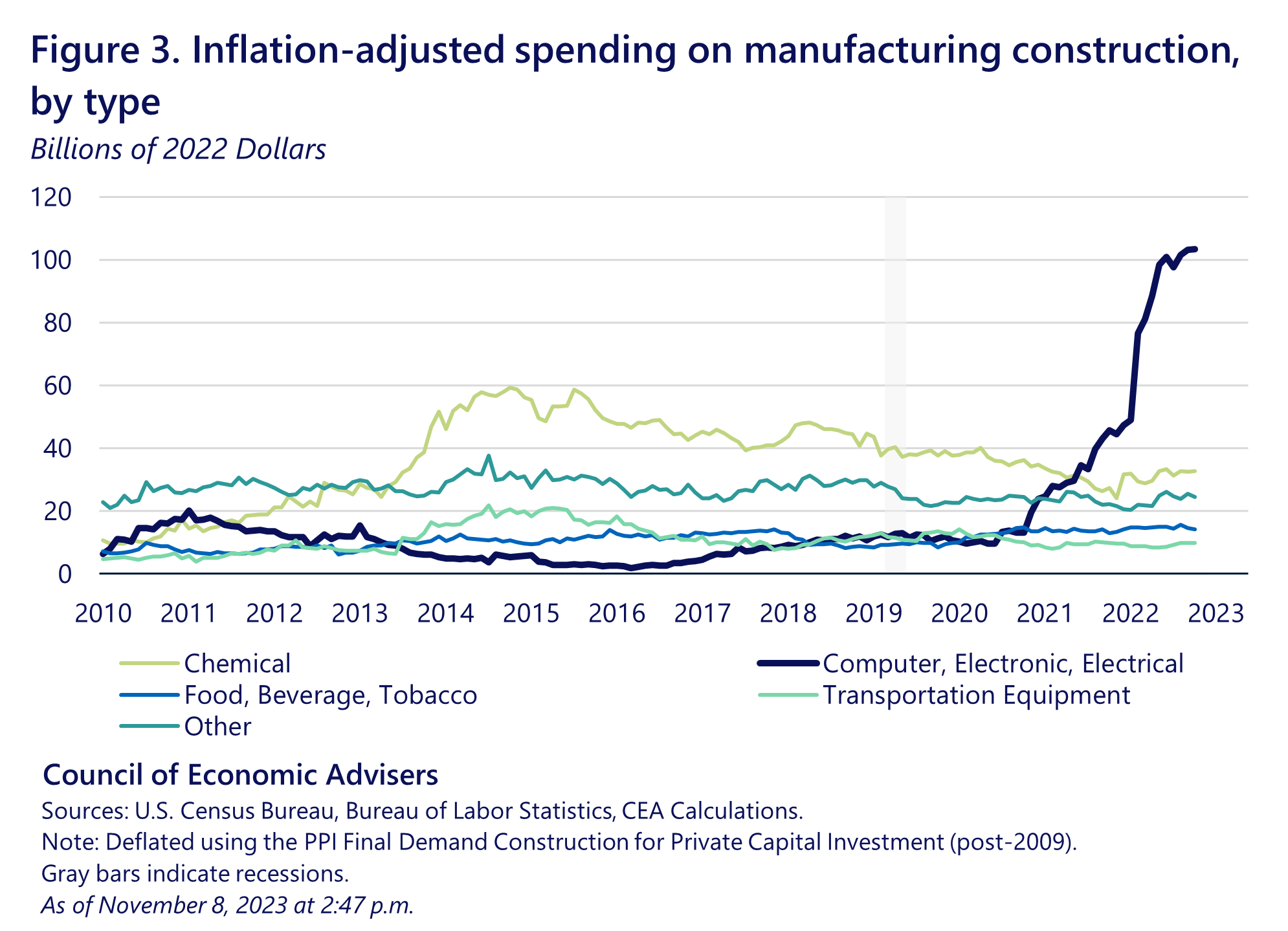 This boom in the construction of new and expanded manufacturing facilities has been driven by certain critical industries where manufacturing capacity had become disproportionately reliant on concentrated foreign suppliers. While inflation-adjusted construction in other manufacturing industries, like those related to food and beverages, has remained roughly static, the sharp increase has been driven by a spike in investment across computer, electrical, and electronic industries. In September 2023, there was over $100 billion (at an annual rate) in investment for the construction of these manufacturing facilities. This includes plants for semiconductor fabrication and battery manufacturing—a more than 8.5-fold increase compared to the 2019 average (see figure 3).