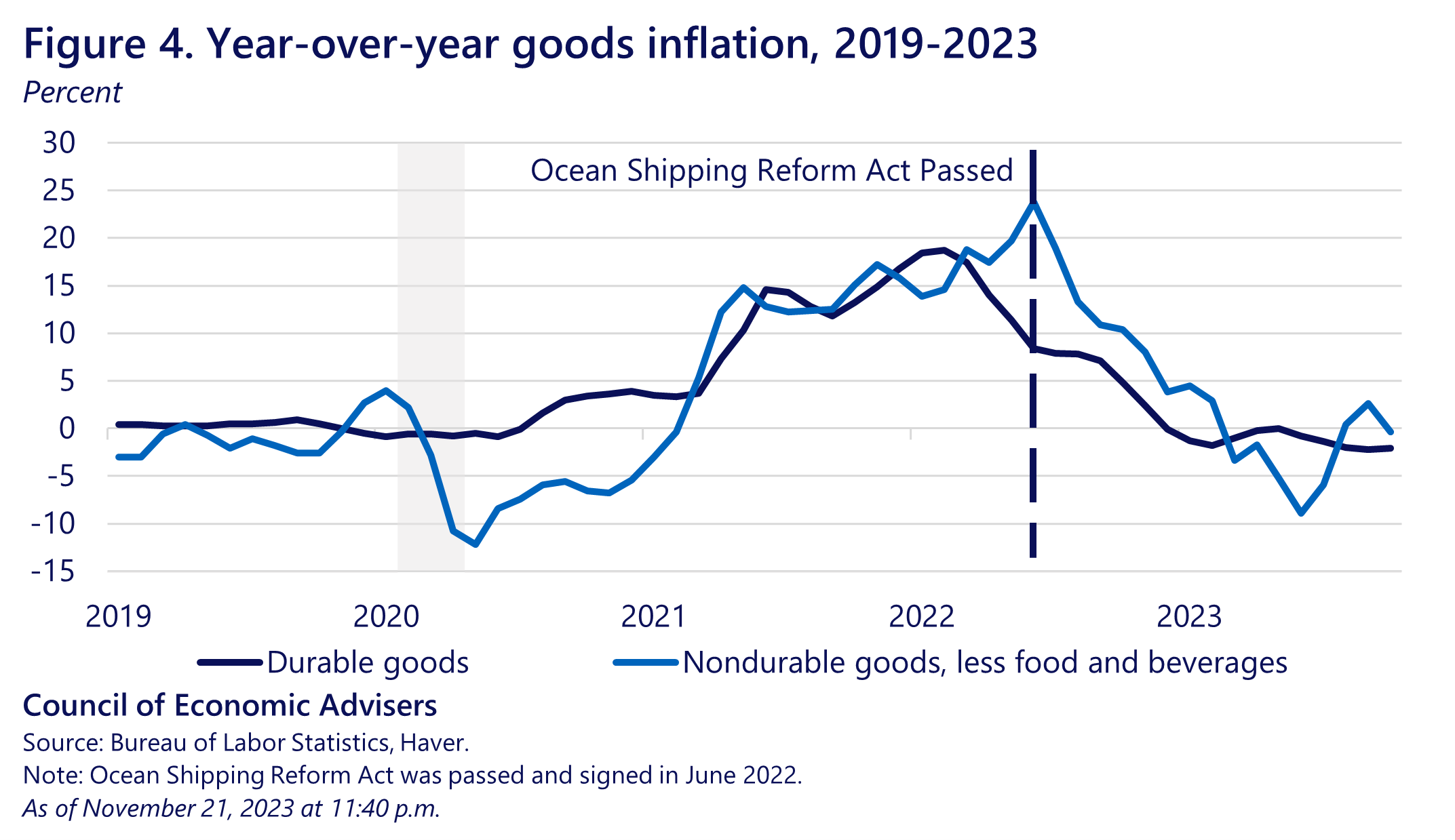 The Biden-Harris Administration worked in partnership with Congress to put in place new legislation to alleviate specific supply chain disruptions and promote greater resilience in the future. Prior analysis has shown that international shipping costs can translate into broader U.S. inflation (Sly et al. 2016). In June 2022, President Biden signed the Ocean Shipping Reform Act to address port and ocean shipping challenges. The legislation allows the Federal Maritime Commission to introduce a ban on unfair and discriminatory practices for shipments and authorized the Bureau of Transportation Statistics to collect additional data about dwell times at various ports, among other provisions. Following these legislative reforms and other Administration efforts to promote competition, ocean shipping prices have normalized to 2019 levels after their 10-fold increase during peak bottlenecks, coinciding with declining goods inflation in late 2022 (see figure 4).