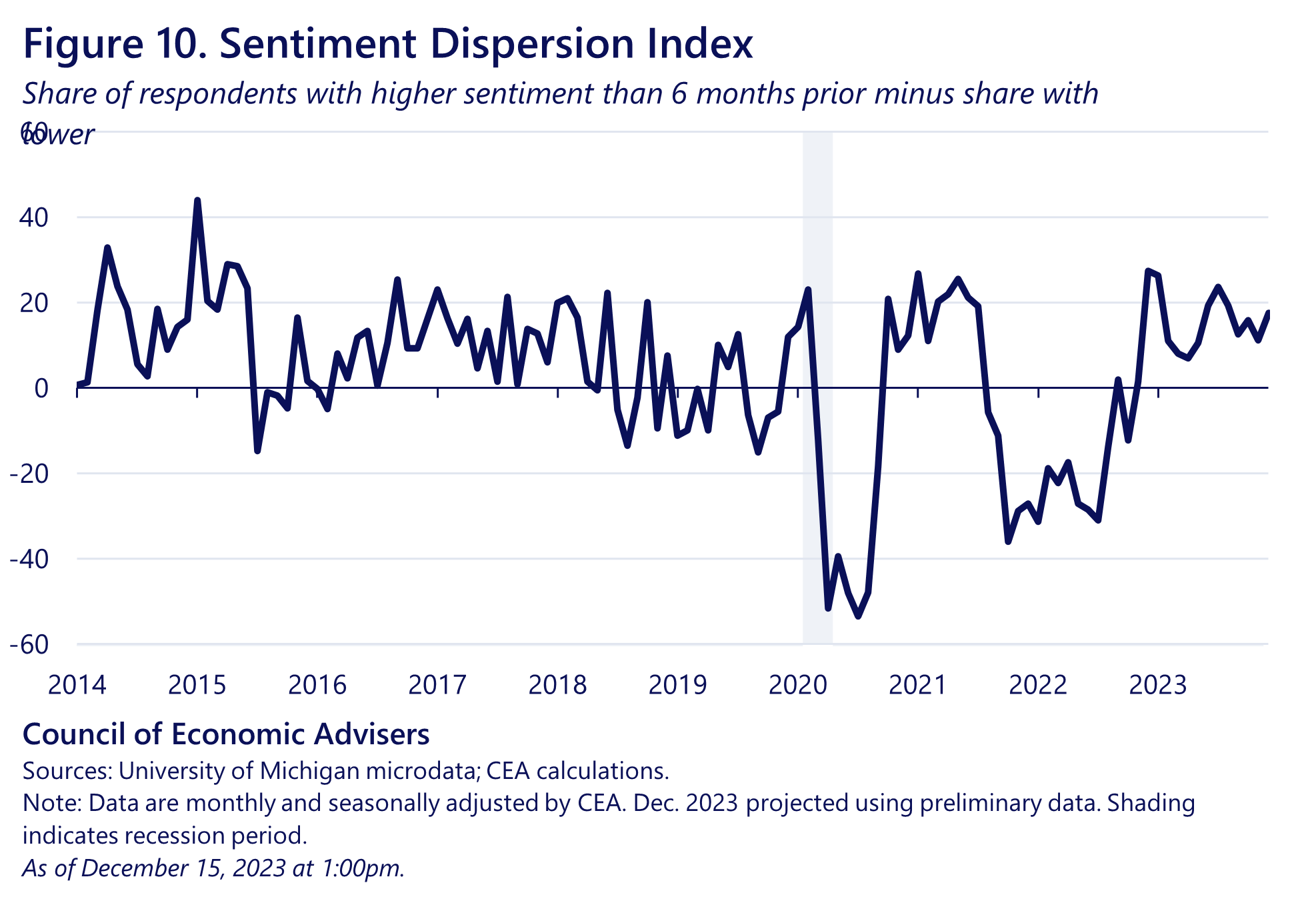 With more work to do on lowering costs, consumer sentiment has further room to grow. However, 2023 saw momentum in the recovery of consumer attitudes. One way to see this is by tracking the same workers over time in the University of Michigan Survey of Consumer Sentiment. Figure 10 shows the difference between the share of respondents who report higher sentiment than they did six months prior and those who report lower sentiment over the same period. Values greater than zero indicate that more respondents are reporting improved sentiment over the period versus a decline in sentiment. Throughout 2023, the net share of respondents reporting higher sentiment than they had 6 months prior reached between 10-20 percentage points, a level of momentum historically associated with robust economic growth.