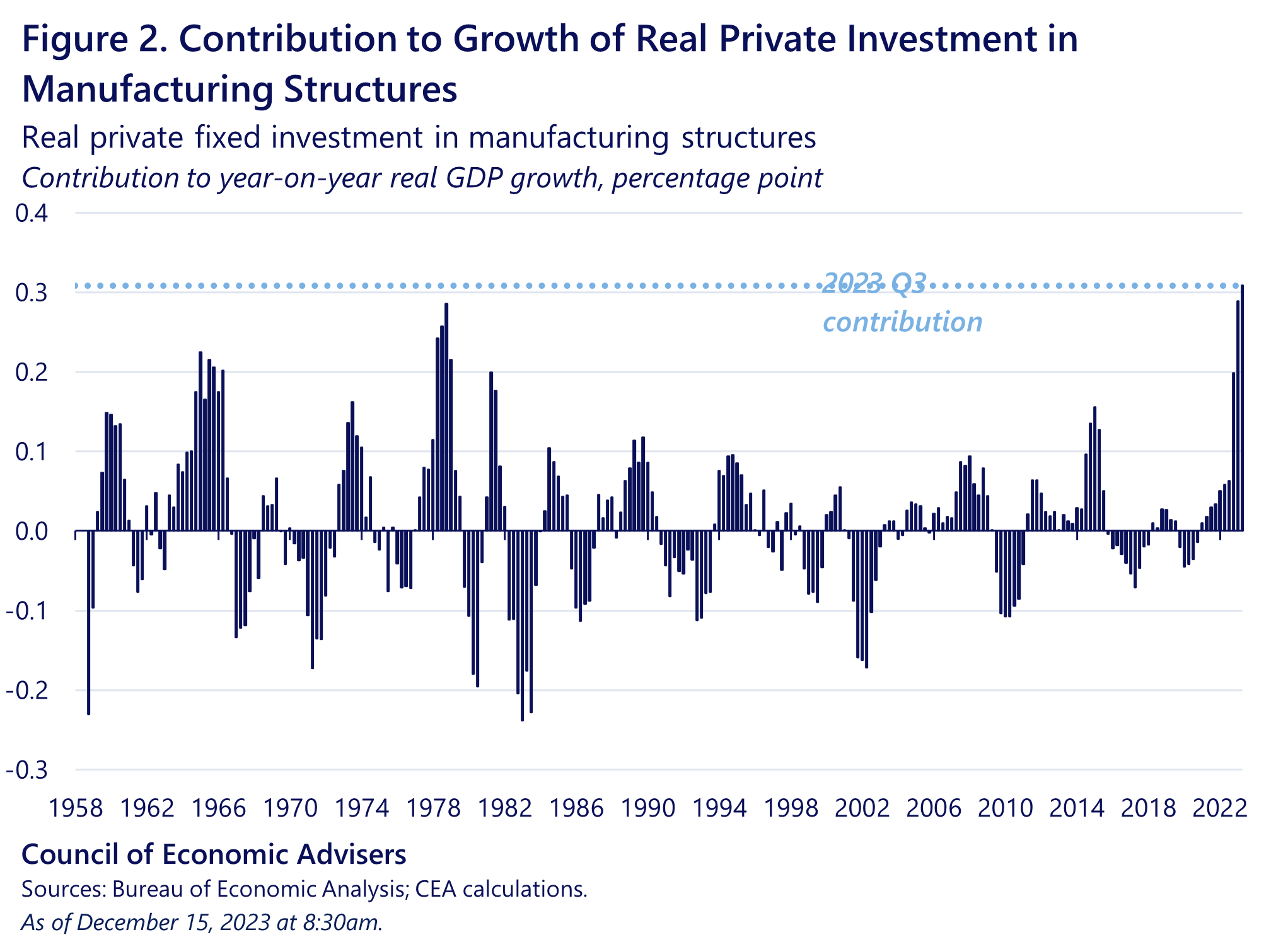 In 2023 Q3, real (inflation-adjusted) private manufacturing construction investment reached its highest level on record since 1958. Likewise, manufacturing construction contributed the most to year-on-year real GDP growth on record. A major factor in this historic manufacturing boom has been the Inflation Reduction Act.