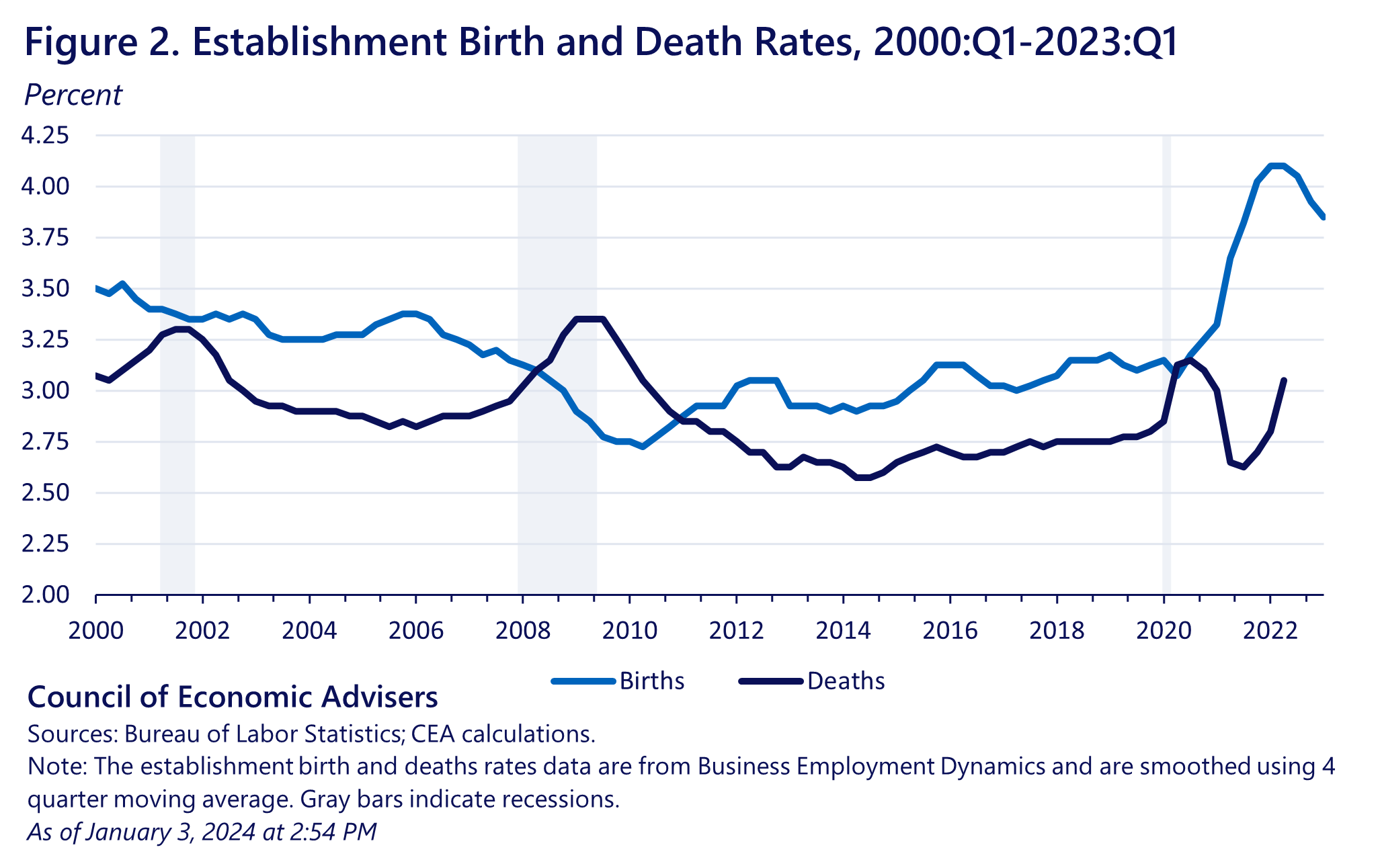 Moreover, alternative measures of business activity also signal robust growth in net-business creation, rather than a renormalization of business activity following the COVID-19 Recession. For example, the dynamics of business establishment births and deaths can provide an early indication of longer run trends in business creation. To this end, Figure 2 plots the establishment birth (light blue) and death rates (dark blue), captured by the Business Employment Dynamics data published by the Bureau of Labor Statistics, for 2000 to 2023. Establishment births accelerated in 2020 and reached an unprecedented 4.1 percent of total establishments in 2022, compared to a birth rate of 3.2 percent in the years between the Great Recession and the COVID-19 Recession. Establishment deaths, on the other hand, followed a similar pattern during the COVID-19 Recession and recovery as in previous business cycles, ranging between 2.6 and 3.1 percent. This has resulted in a wider gap between birth and death rates of establishments over the past three years than compared to the last business cycle and points to a persistent shift towards a high level of new business formation.