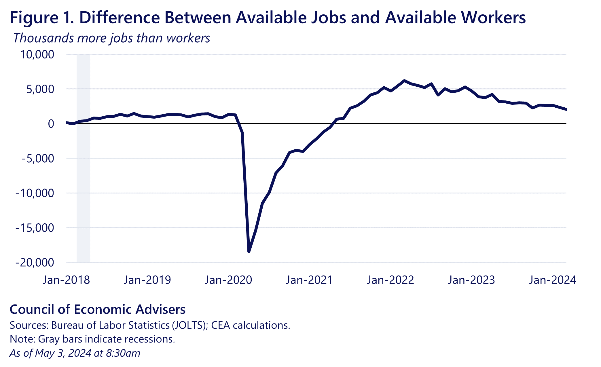 Figure 1 shows the ongoing realignment of labor demand and labor supply. It simply subtracts the labor force from the sum of jobs plus vacancies. Putting aside the frictional unemployment that always persists in job markets, and making up simple numbers to elucidate the concept, if employment was 7 and there were 3 openings, demand equals 10; if the labor force also equals 10, then there’s no gap: supply and demand are aligned.