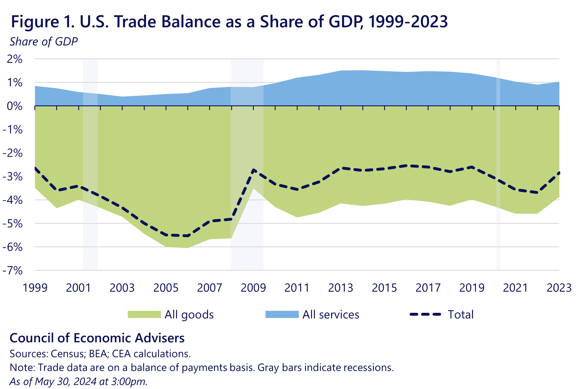 Services exports collectively represent the high-value-added activities in which the United States maintains a global comparative advantage. Although the perennial U.S. goods trade deficit overshadows the enduring surplus in U.S. services trade (figure 1), in 2023, exports of services ($1 trillion) were the highest on record[1] and the services trade surplus ($278.4 billion) was the highest since 2019.