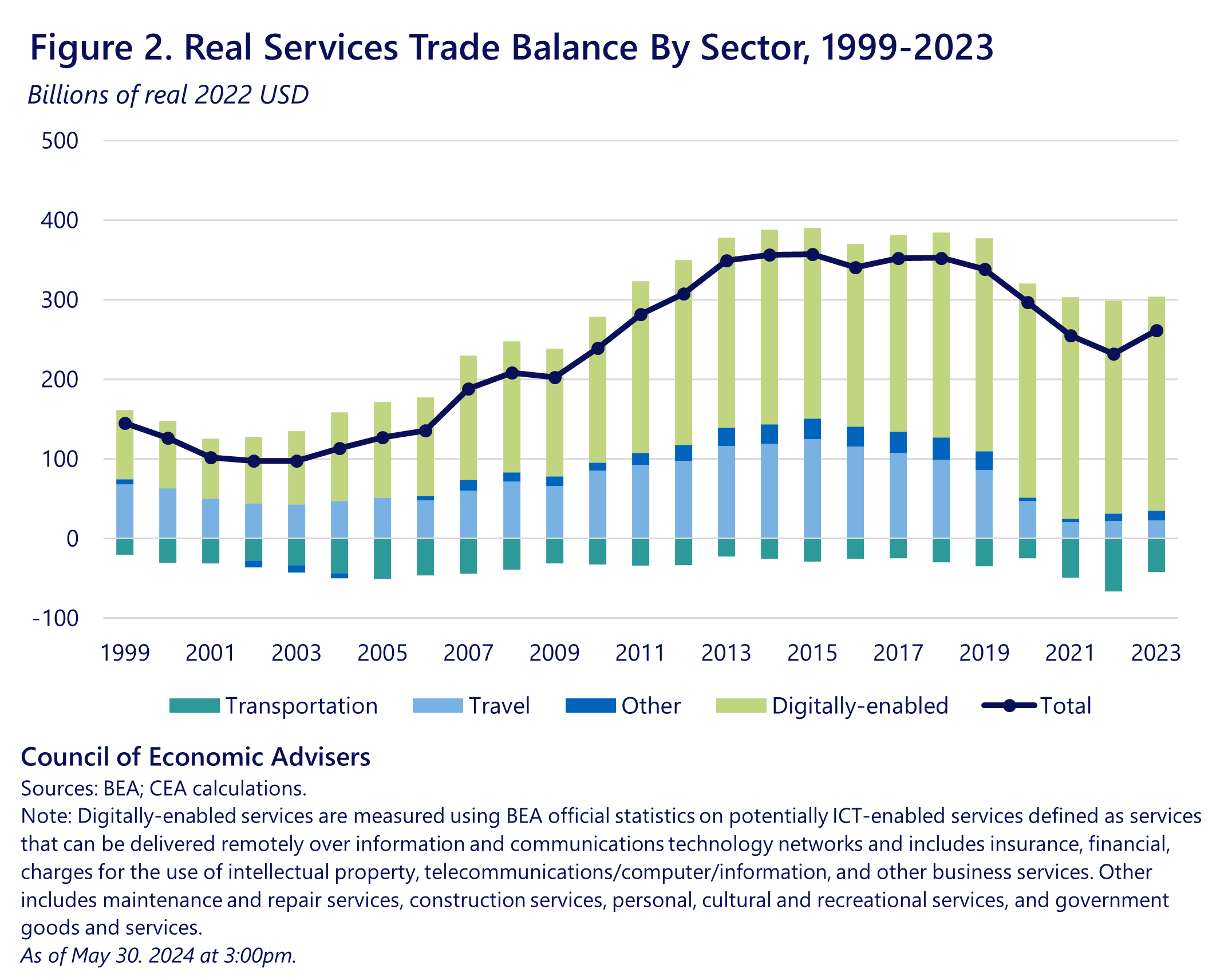 Since the late 2000s, the services trade surplus has been fueled primarily by the growth in digitally-enabled services (figure 2). Digitally-enabled services encompass those services predominantly delivered over information and communication technologies (ICT) networks including ICT services.[2] Some examples of digitally-enabled services include licenses to use computer software, cloud computing and data storage services, and royalty payments for industrial designs to manufacture specialized equipment.