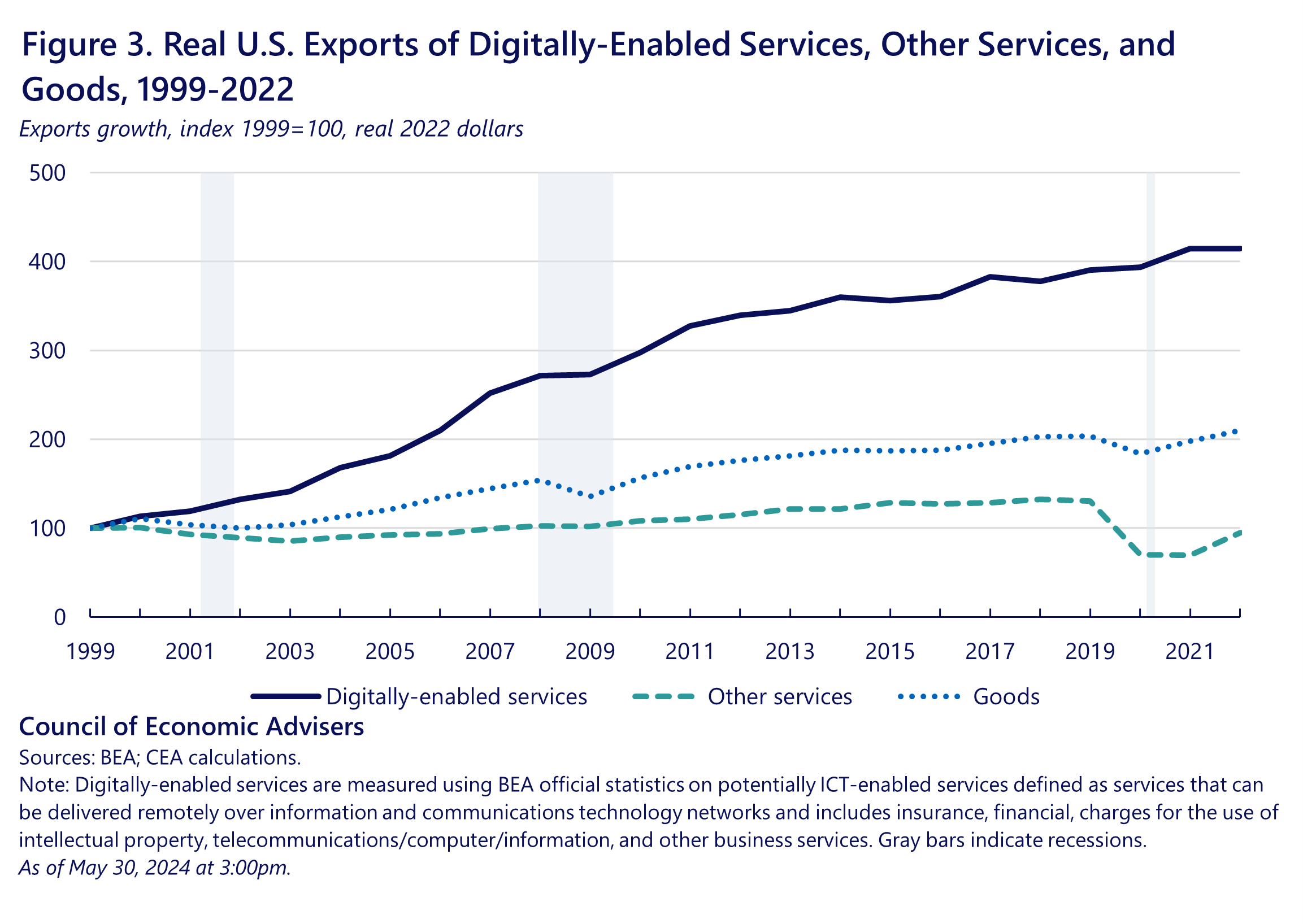[3] The three types of exports had different bases in 1999: goods was $996 billion; digitally-enabled services was $151 billion; and other services was $319 billion (in 2022 dollars).
