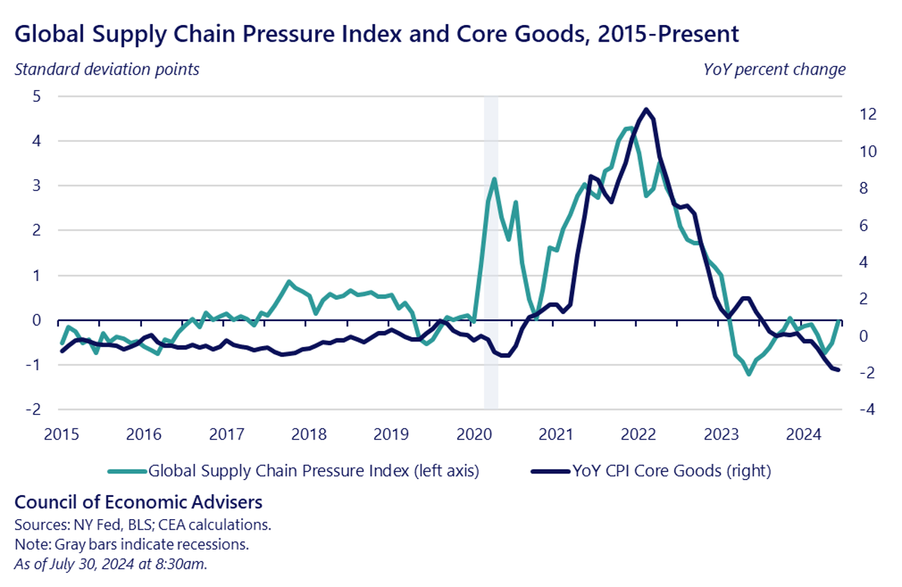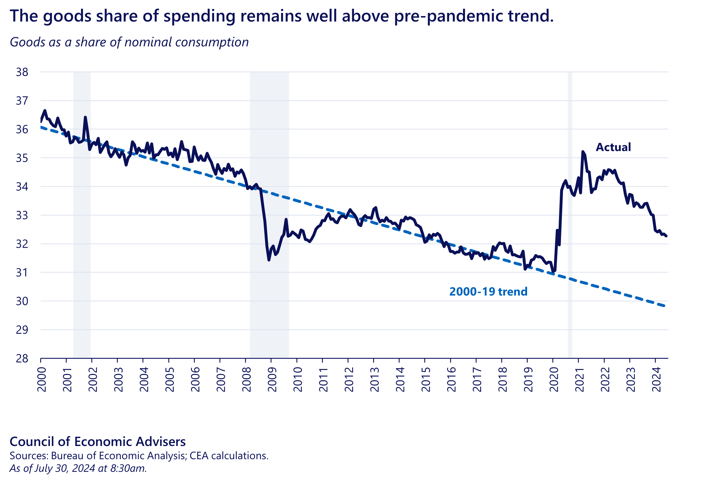 Starting with “what happened?”, consider the CPIs rise and fall in both year-over-year and on an annualized quarterly basis, included to show near-term dynamics, which are always very important to us in the White House. Disinflation took hold in the second half of last year, but appeared to stall in first few months of this year. More recent inflation prints, however, appear to confirm CEAs view that the Q1 pause was just that, and that the forces of disinflation—forces which I will explore in detail today—remain in play and can be seen by their good works in more recent prints.