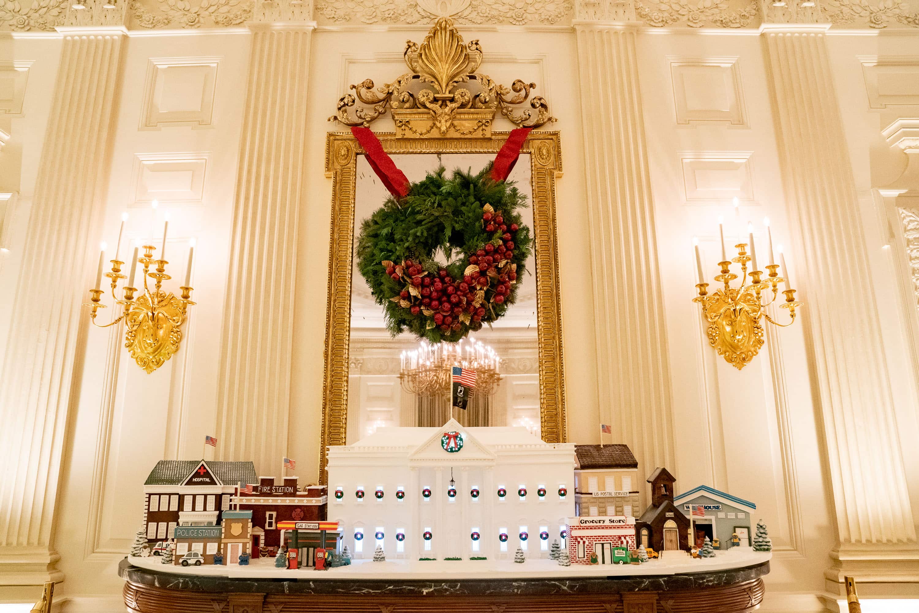 Situated on the eagle pier table in the State Dining Room is the official 2021 Gingerbread White House. This year’s gingerbread display is inspired by our gratitude and admiration for our Nation’s frontline workers who kept our country running through the global pandemic, often at great risk to themselves and their families.