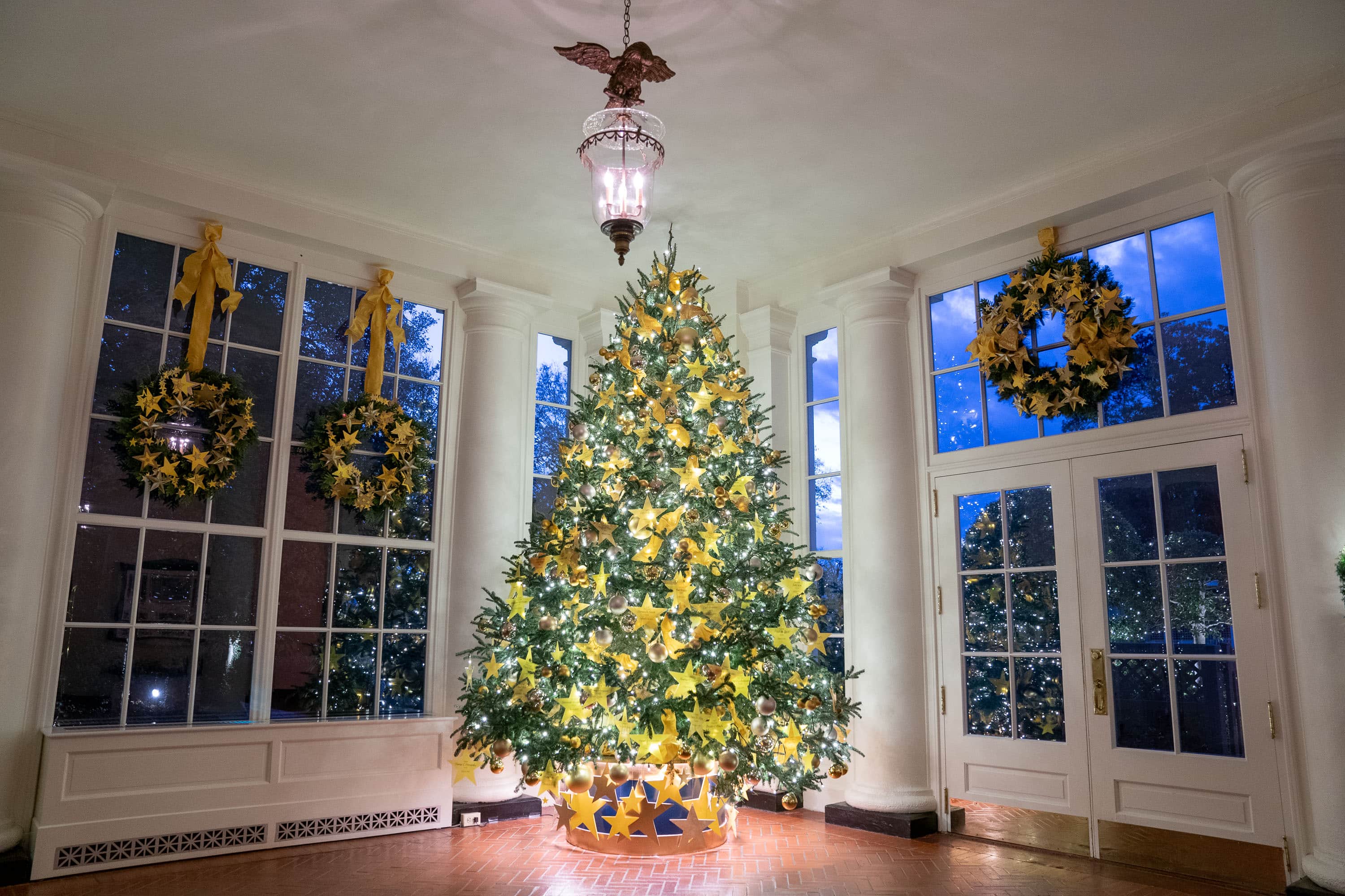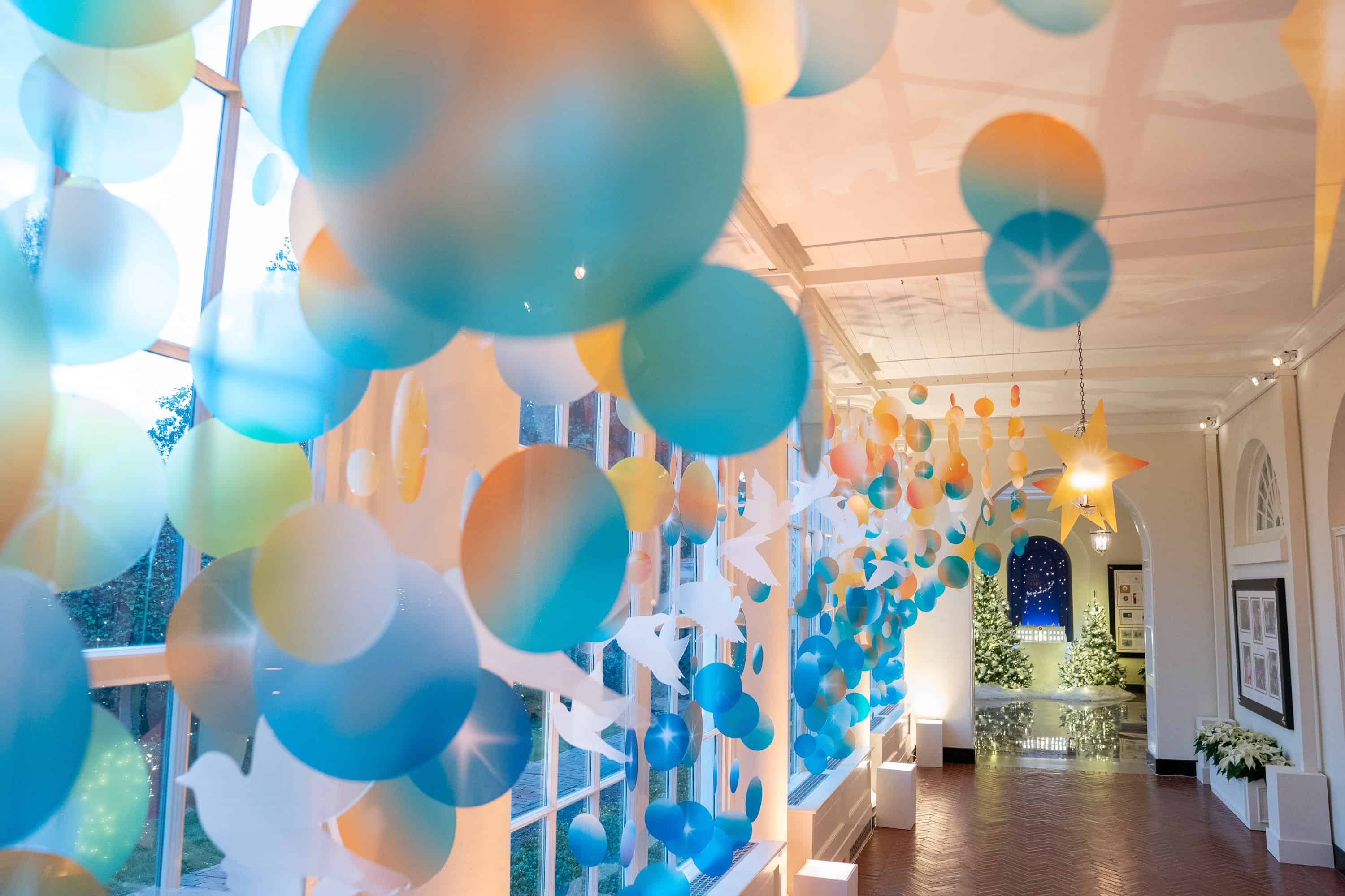 Throughout the East Colonnade, iridescent doves and shooting stars illuminate the hallway, representing the peace and light brought to us all by the service of frontline workers and first responders during the pandemic. Poinsettias punctuate the glowing topiaries opposite the windows to the Jacqueline Kennedy Garden, dedicated by First Lady Claudia “Lady Bird” Johnson in 1965. The East Wing of the White House was expanded to its current form in 1942 and includes the Office of the First Lady.
