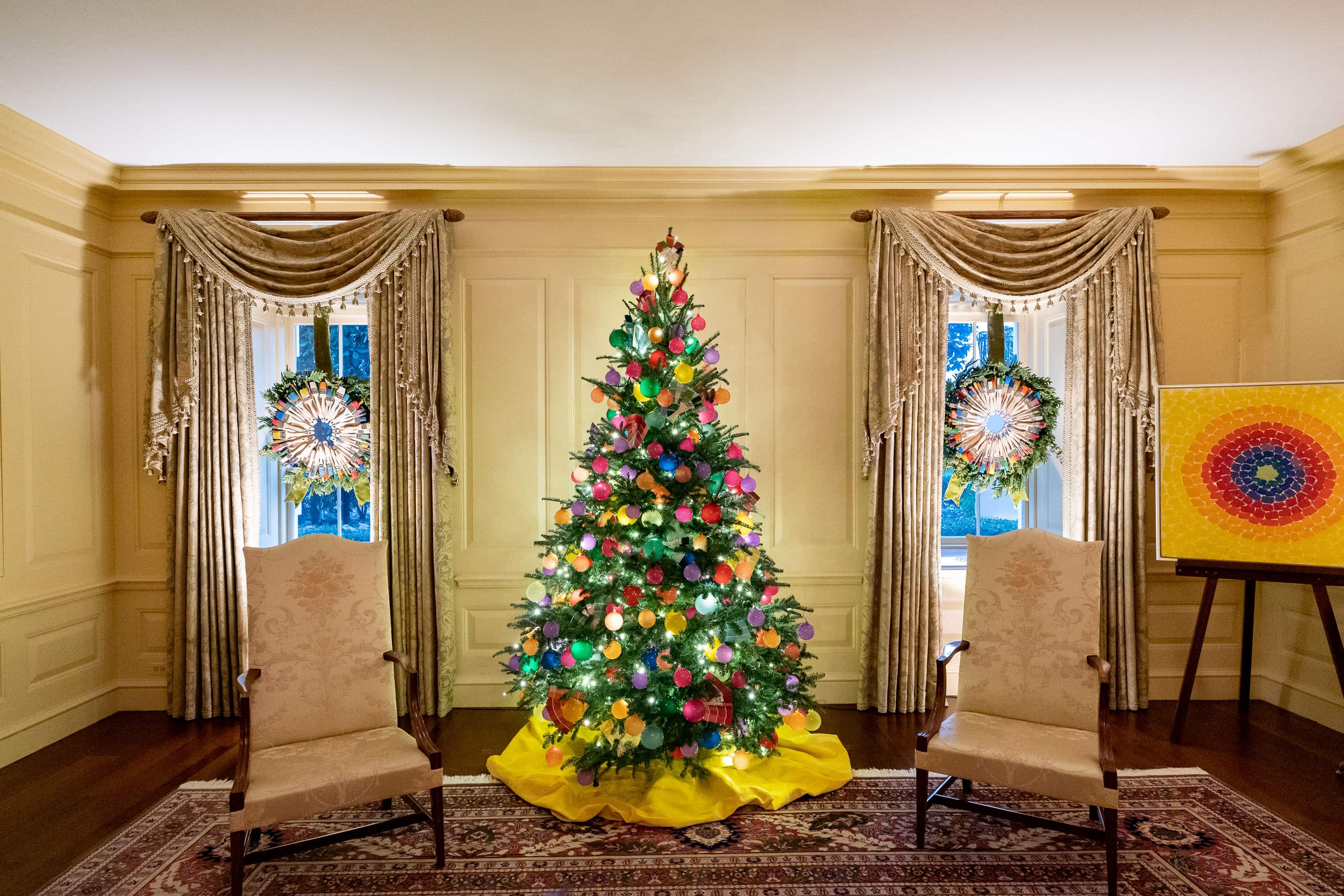 To celebrate the Gift of the Visual Arts, the Vermeil (French for “gilded silver”) Room glows with bright, bold, colorful paint brushes and paint swatches, representing the diverse American artists whose talents bring delight to all. From historic portraits to graphic art displays, from light installations to marble sculptures, from wood carvings to children’s handprint art, the visual arts bring us joy, calm our minds, and inspire our imaginations.