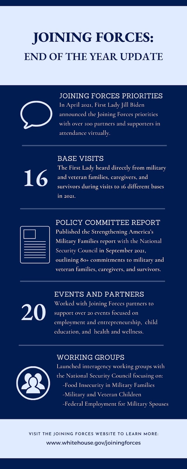 Below, you’ll find a brief recap of our Joining Forces efforts in 2021. As we move into the new year, we look forward to continued collaboration and progress on the needs of military on Employment and Entrepreneurship; Military Child Education; and Health and Well-Being.