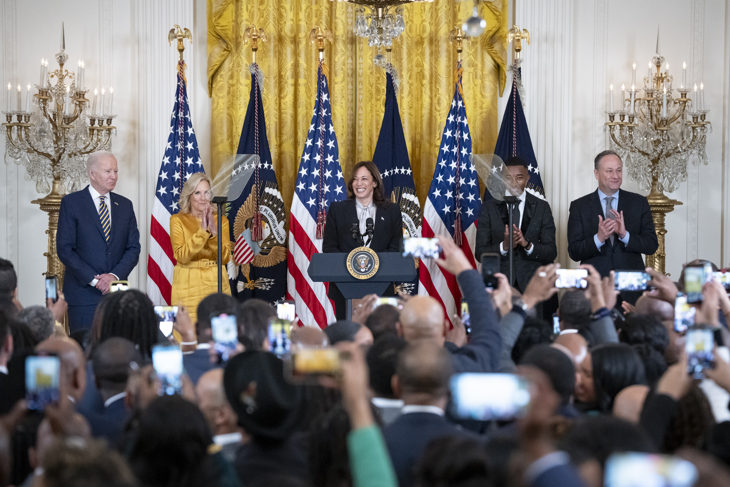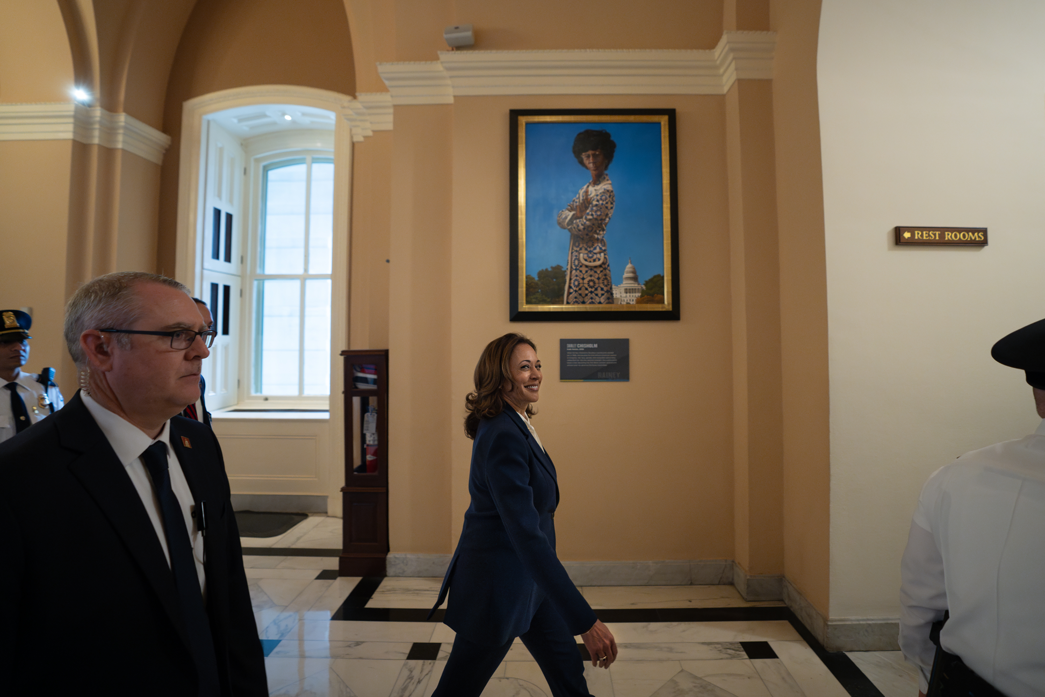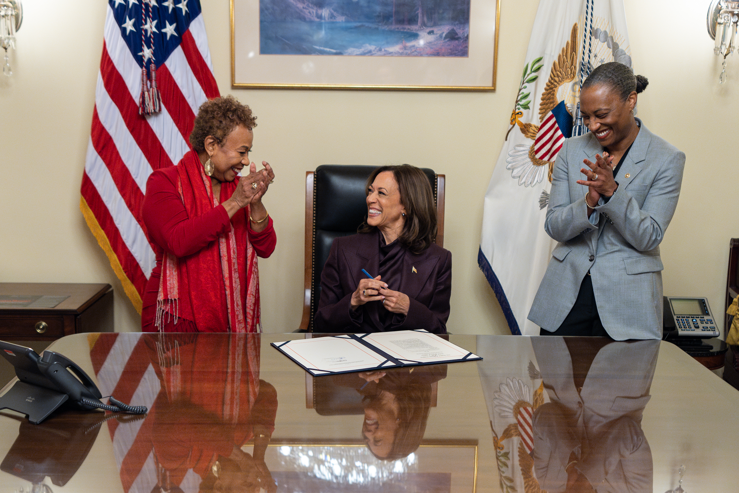 As President of the Senate, Vice President Kamala Harris signs the Shirley Chisholm Congressional Gold Medal Act, which grants the late Congresswoman Chisholm the highest civilian award Congress can bestow.