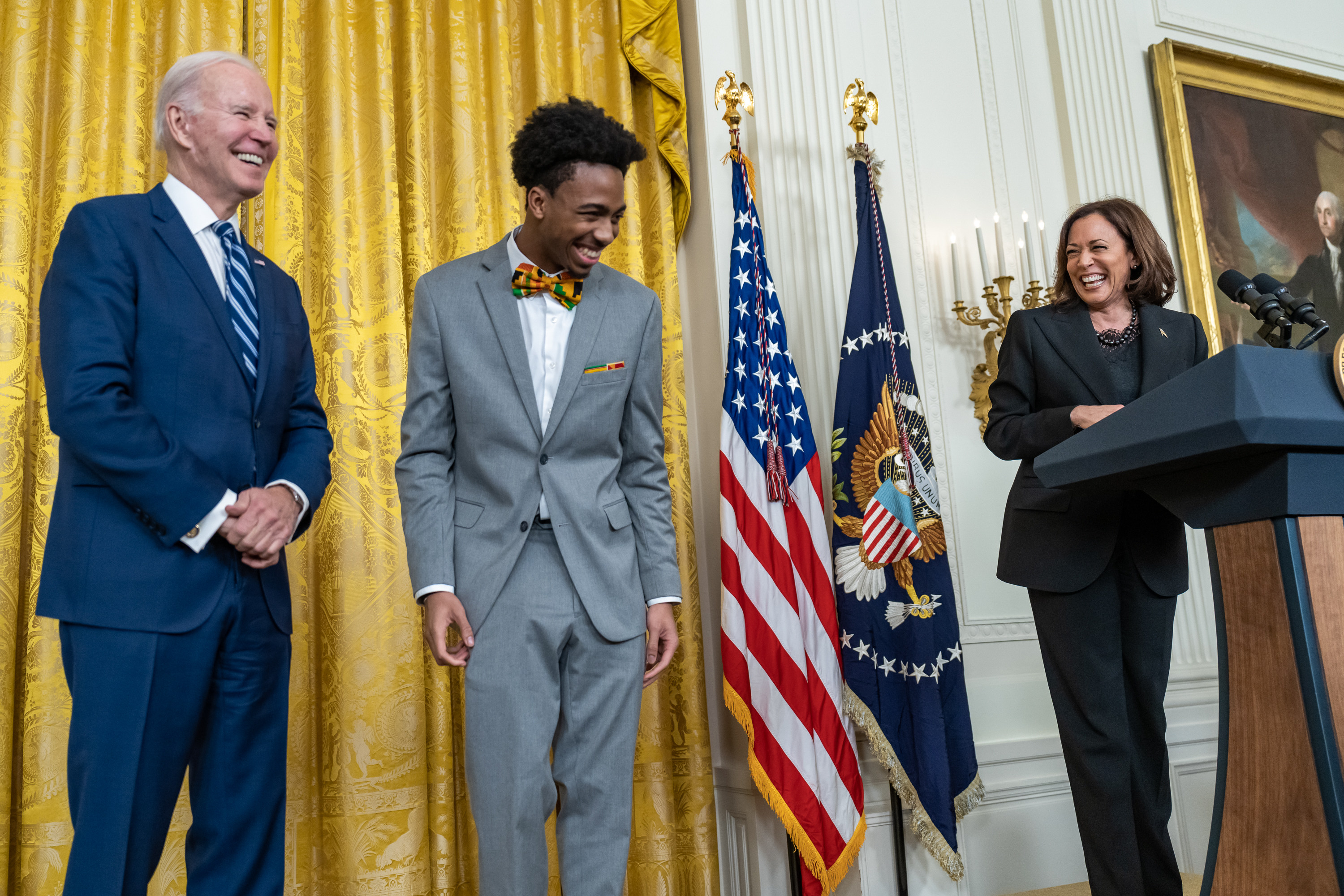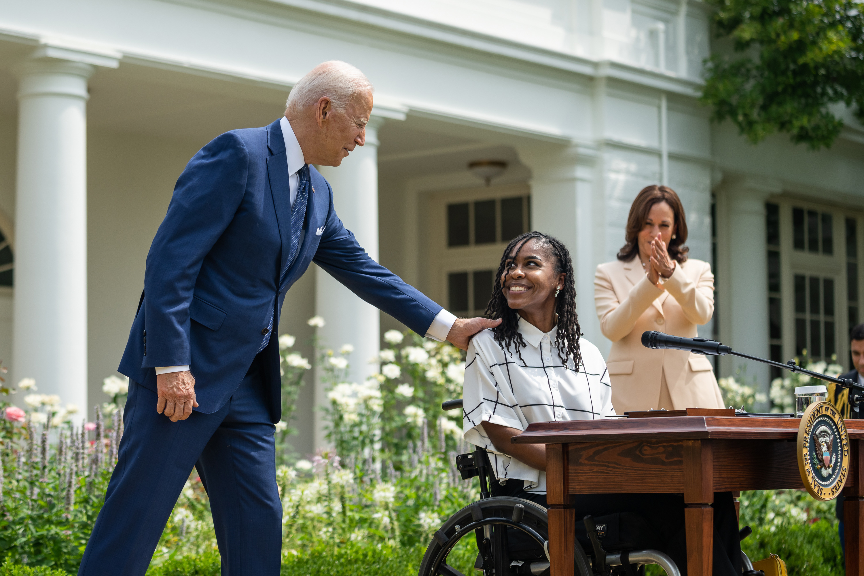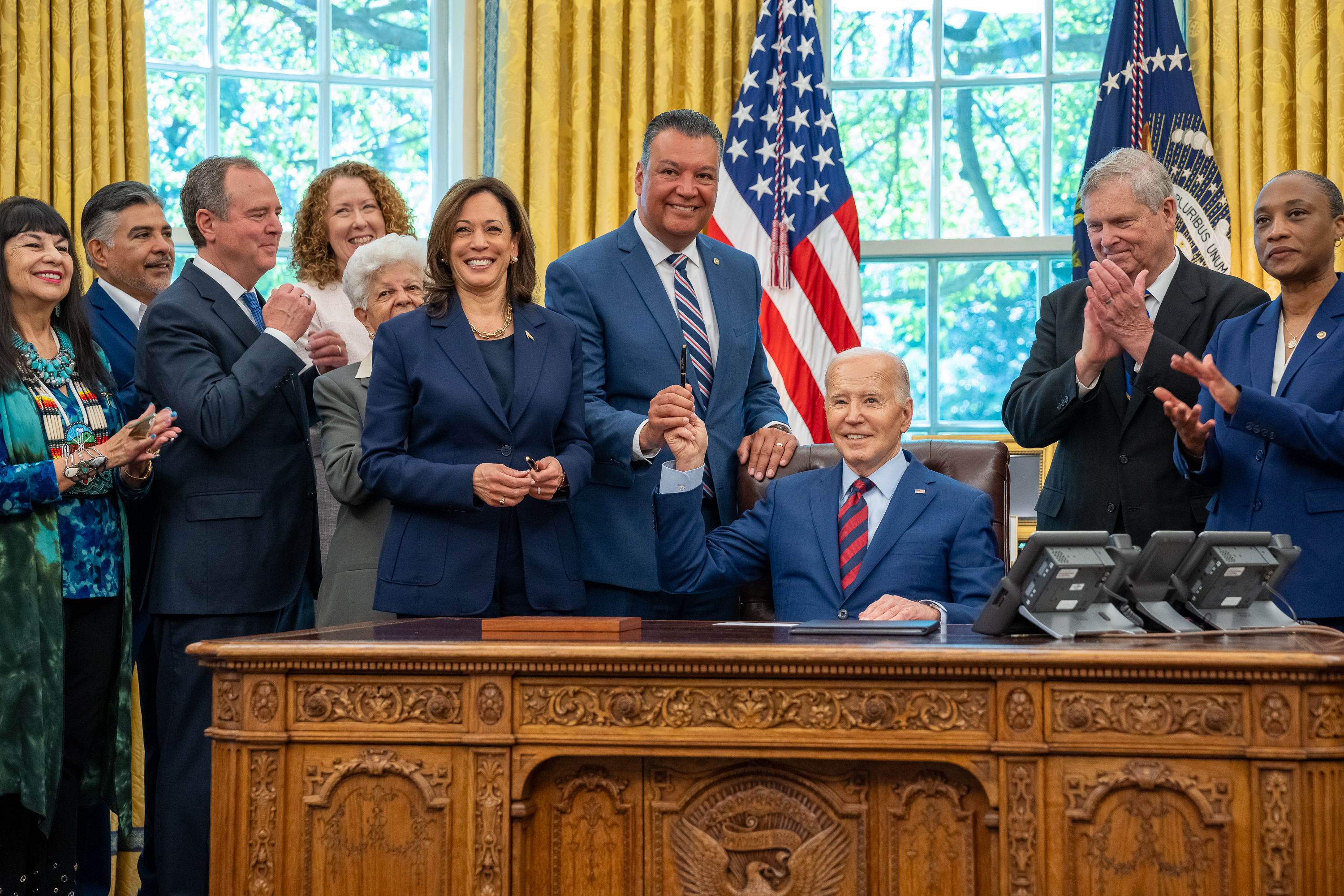 As President of the Senate, Vice President Kamala Harris signs the Shirley Chisholm Congressional Gold Medal Act, which grants the late Congresswoman Chisholm the highest civilian award Congress can bestow.