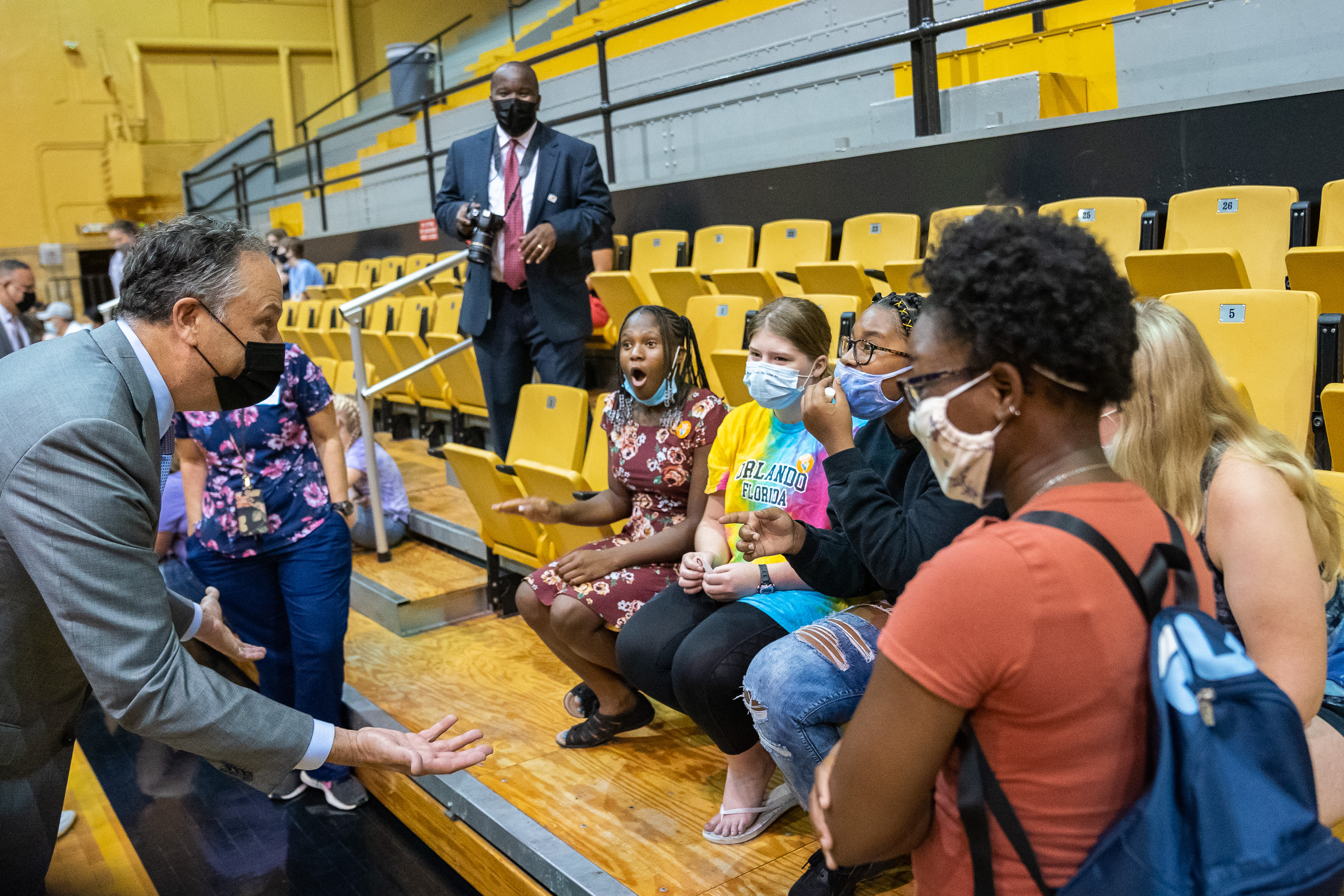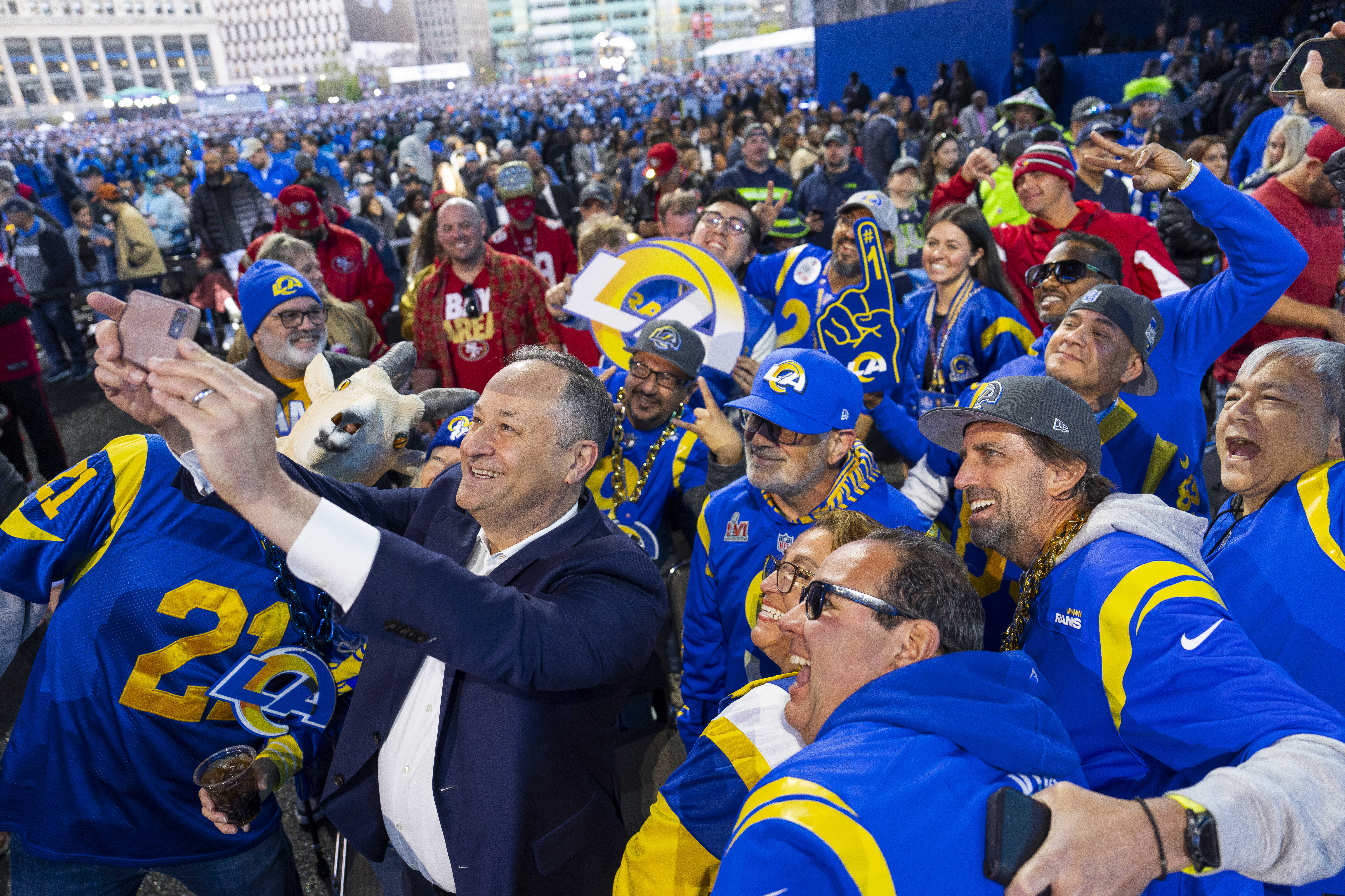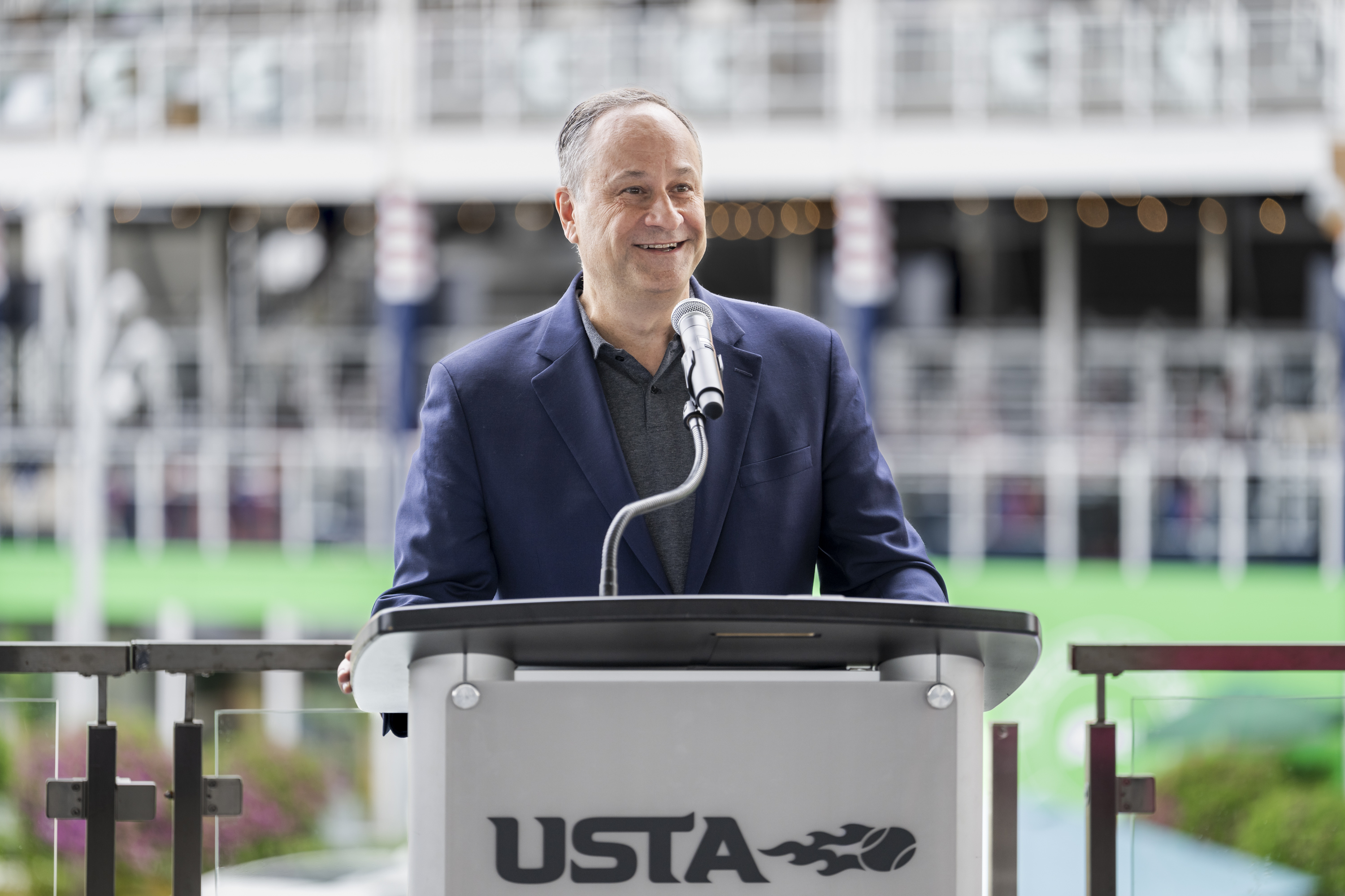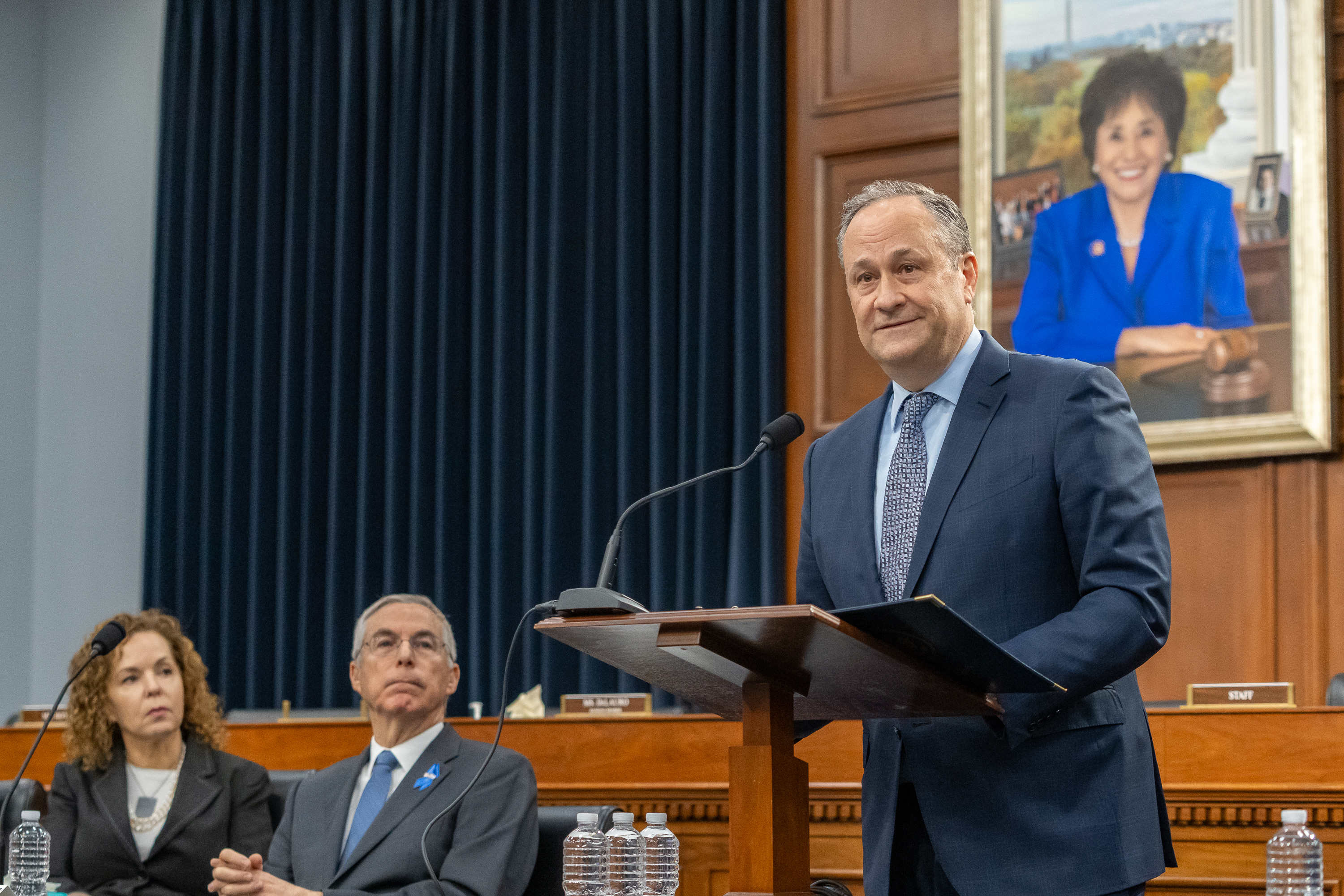 Second Gentleman Douglas Emhoff delivers remarks to volunteers and community members at the Esperanza Health Center to encourage individuals to receive COVID-19 vaccinations.