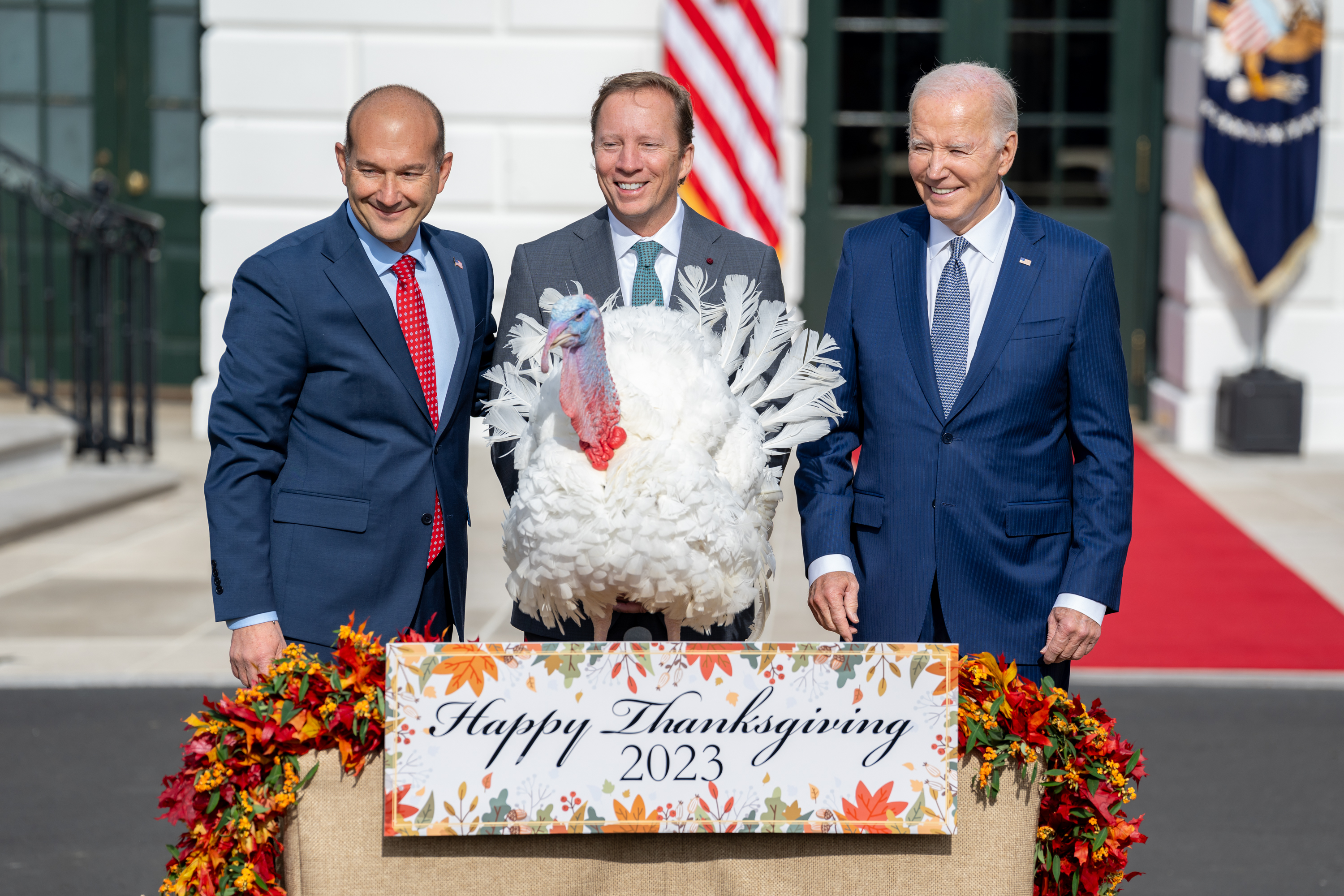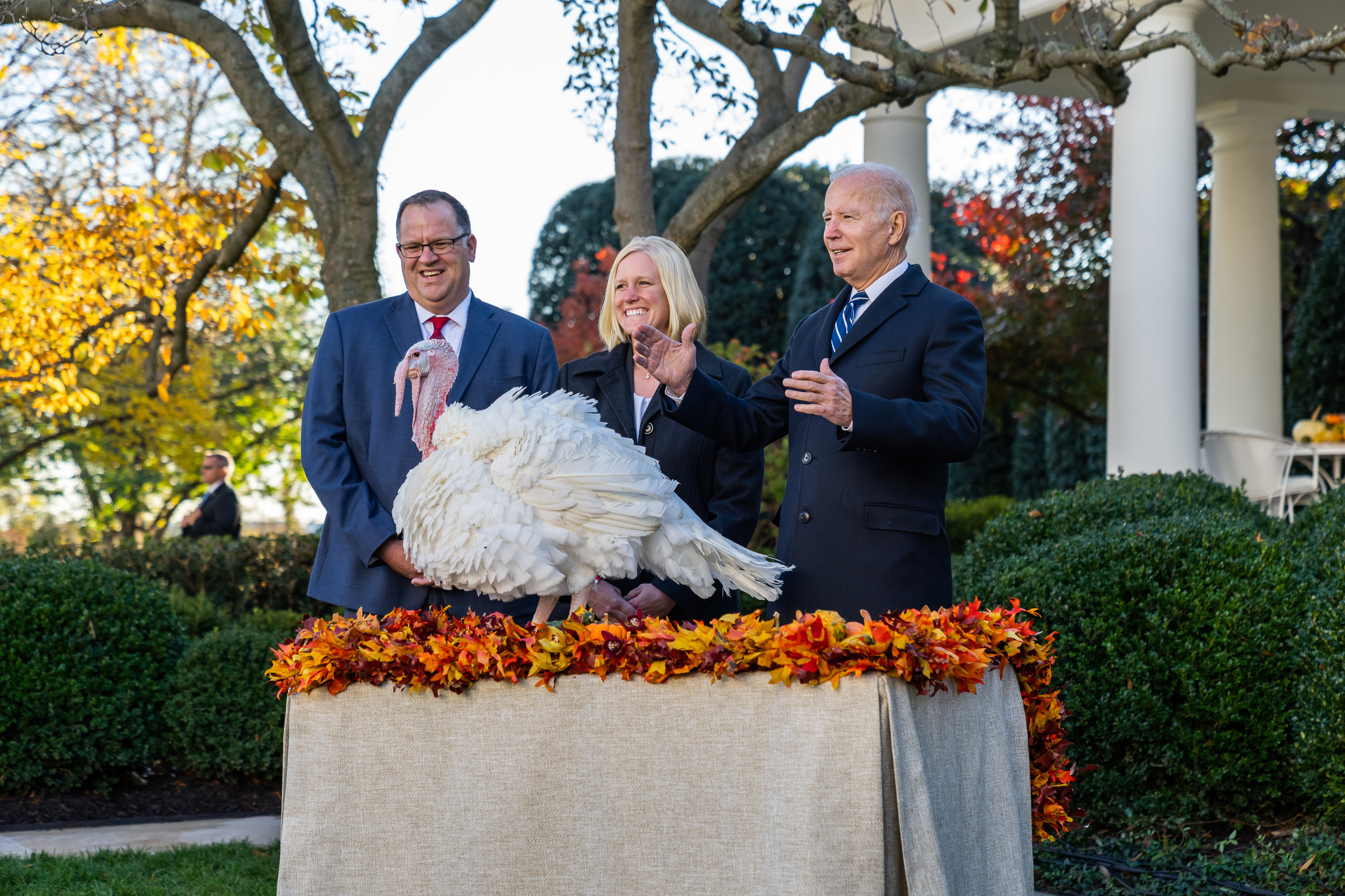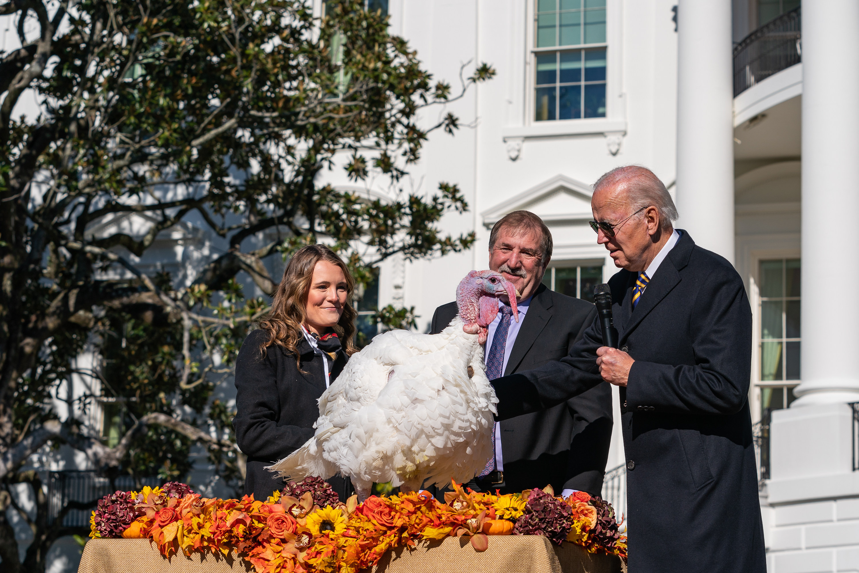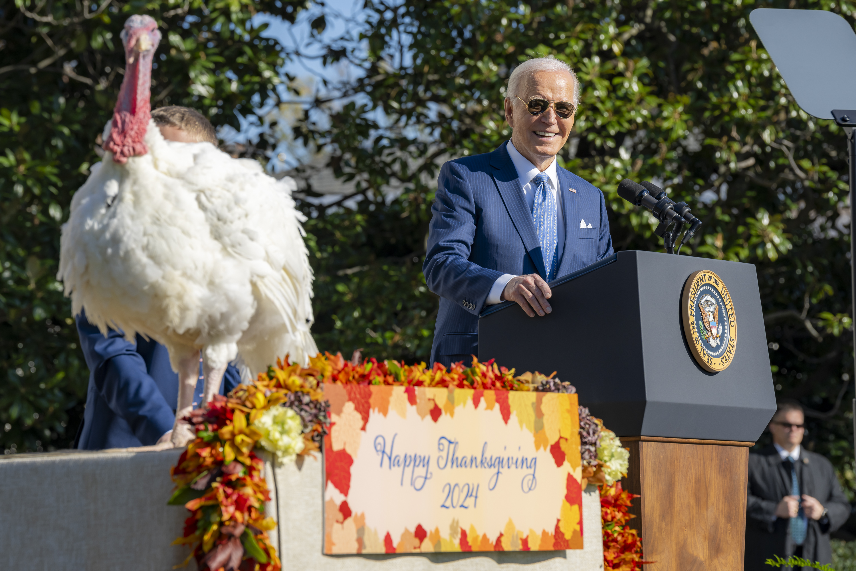 President Joe Biden delivers remarks during the turkey pardoning ceremony of turkeys “Peach” and “Blossom”.
