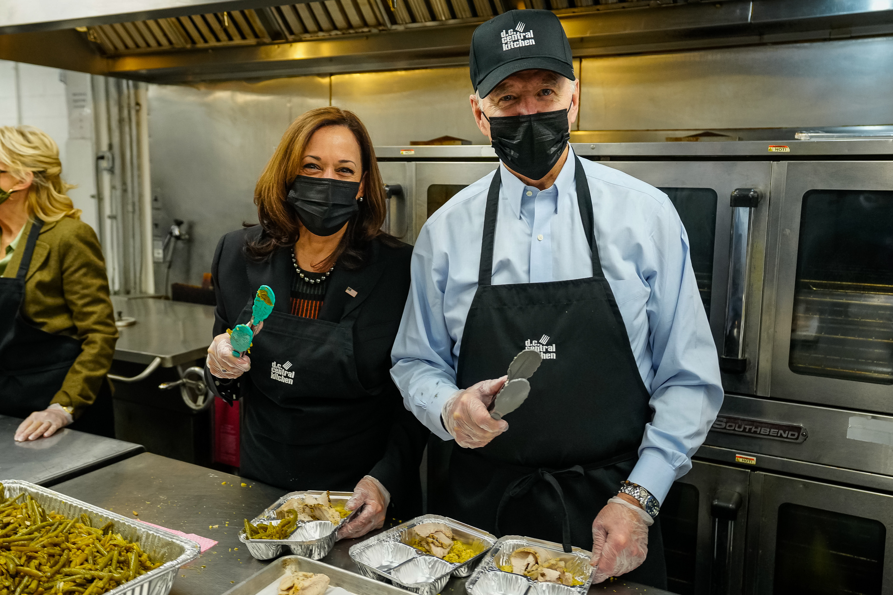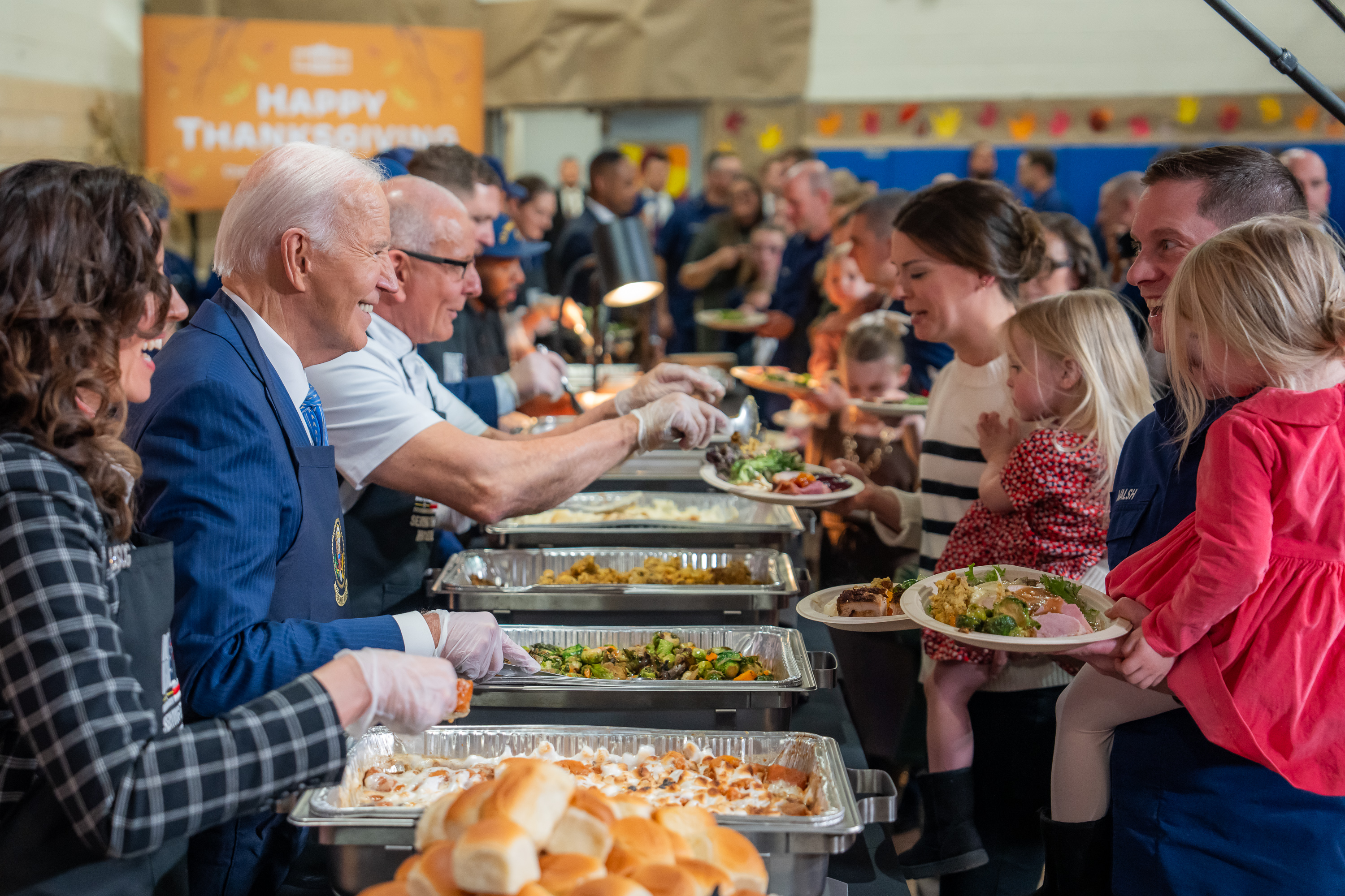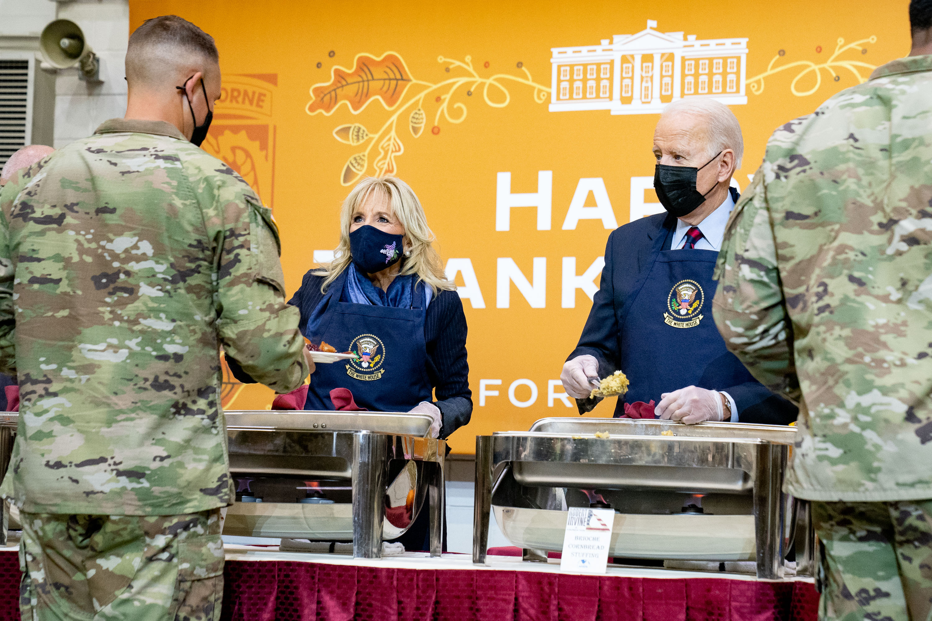 President Joe Biden and First Lady Jill Biden serve meals to military families during a Friendsgiving event at the U.S. Coast Guard Sector New York.