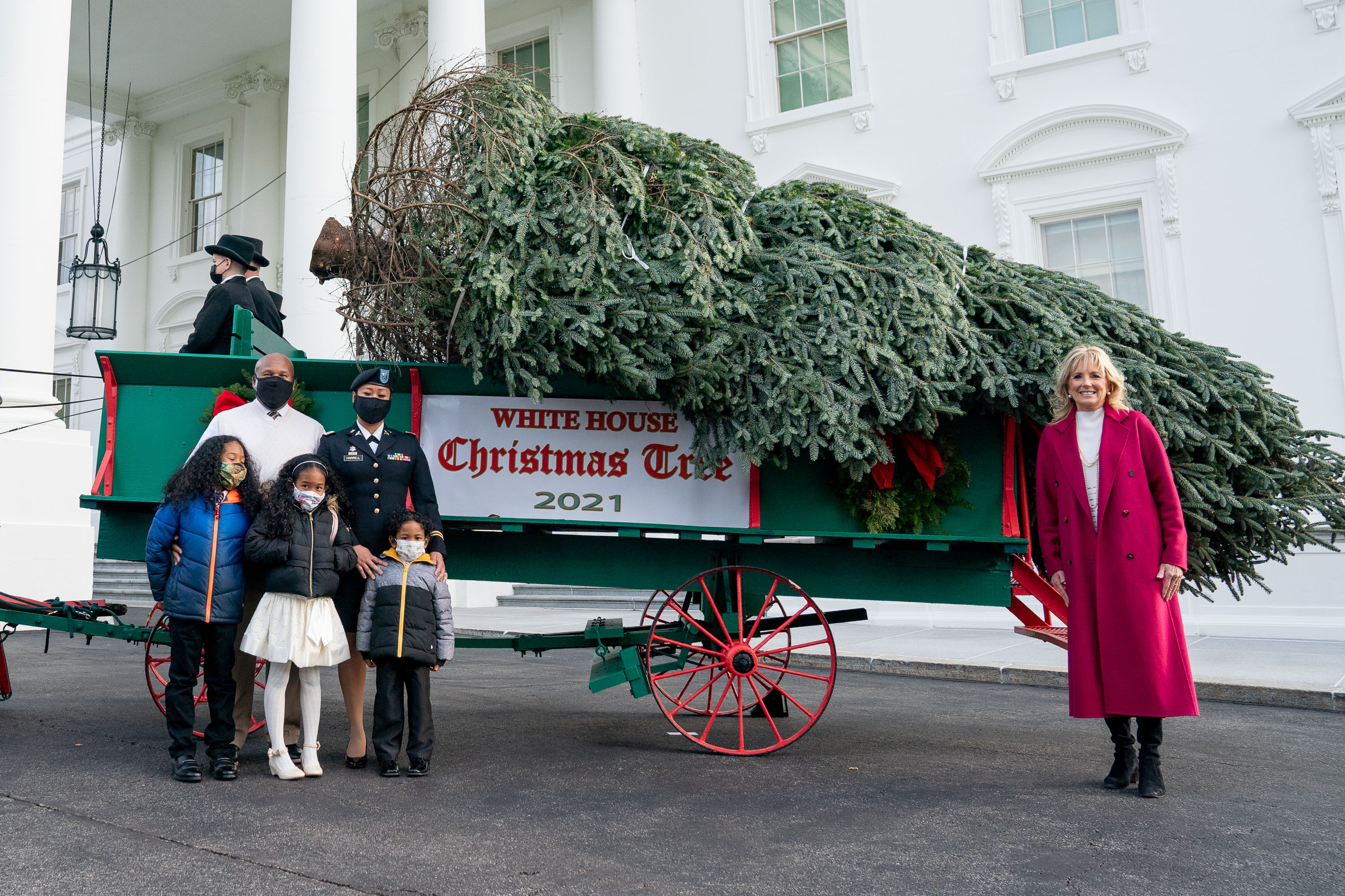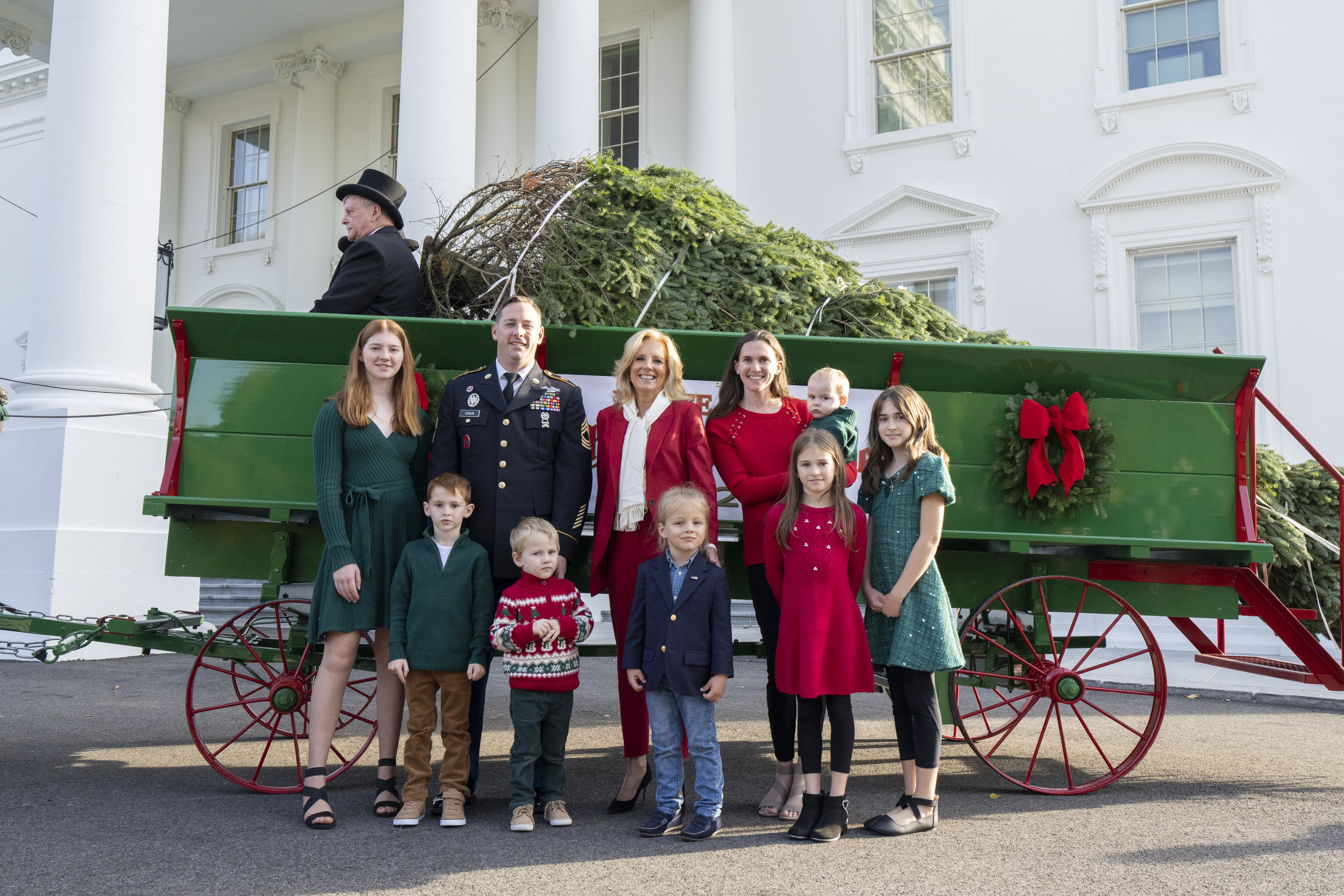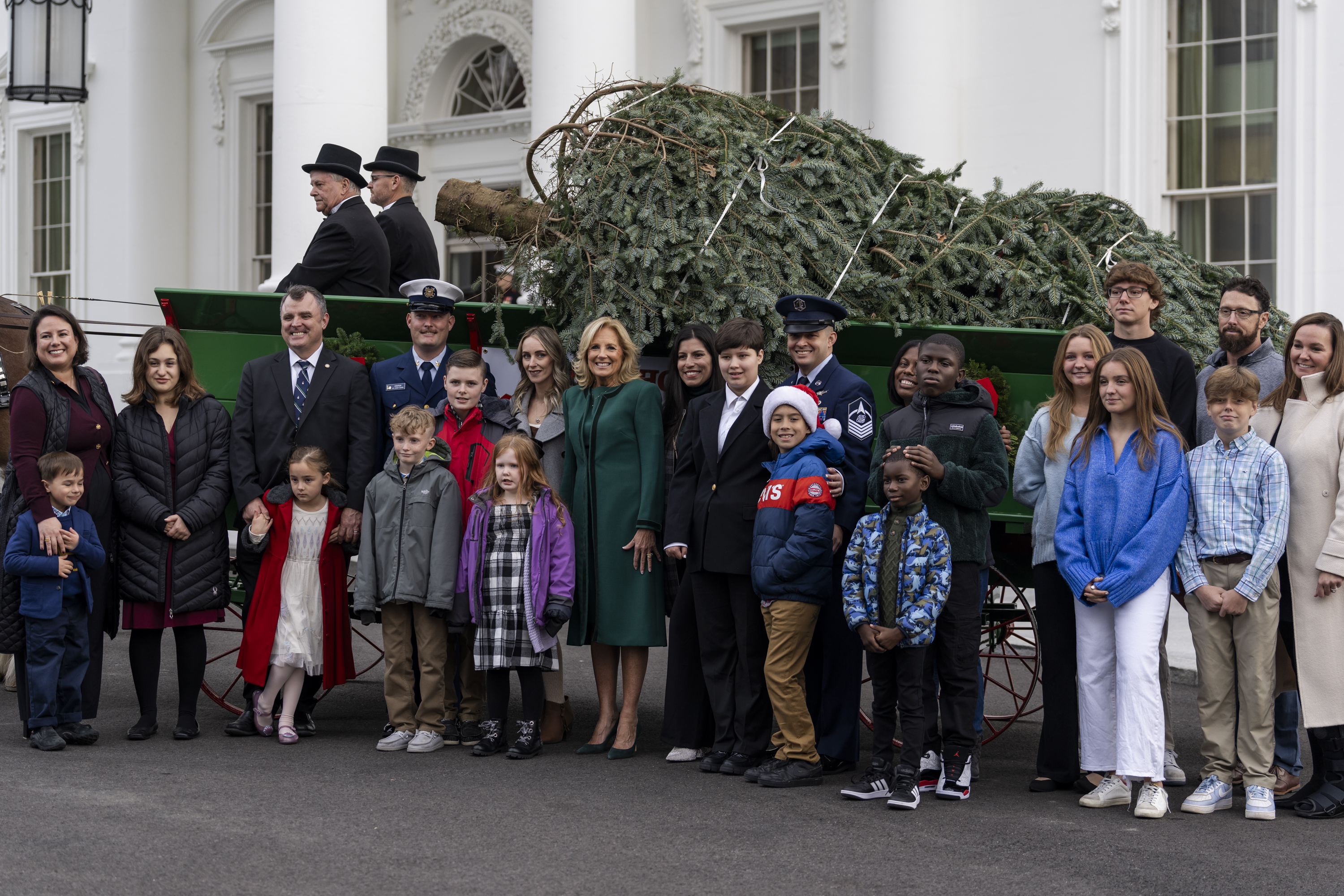 First Lady Jill Biden welcomes the 2024 White House Christmas Tree alongside National Guard families.