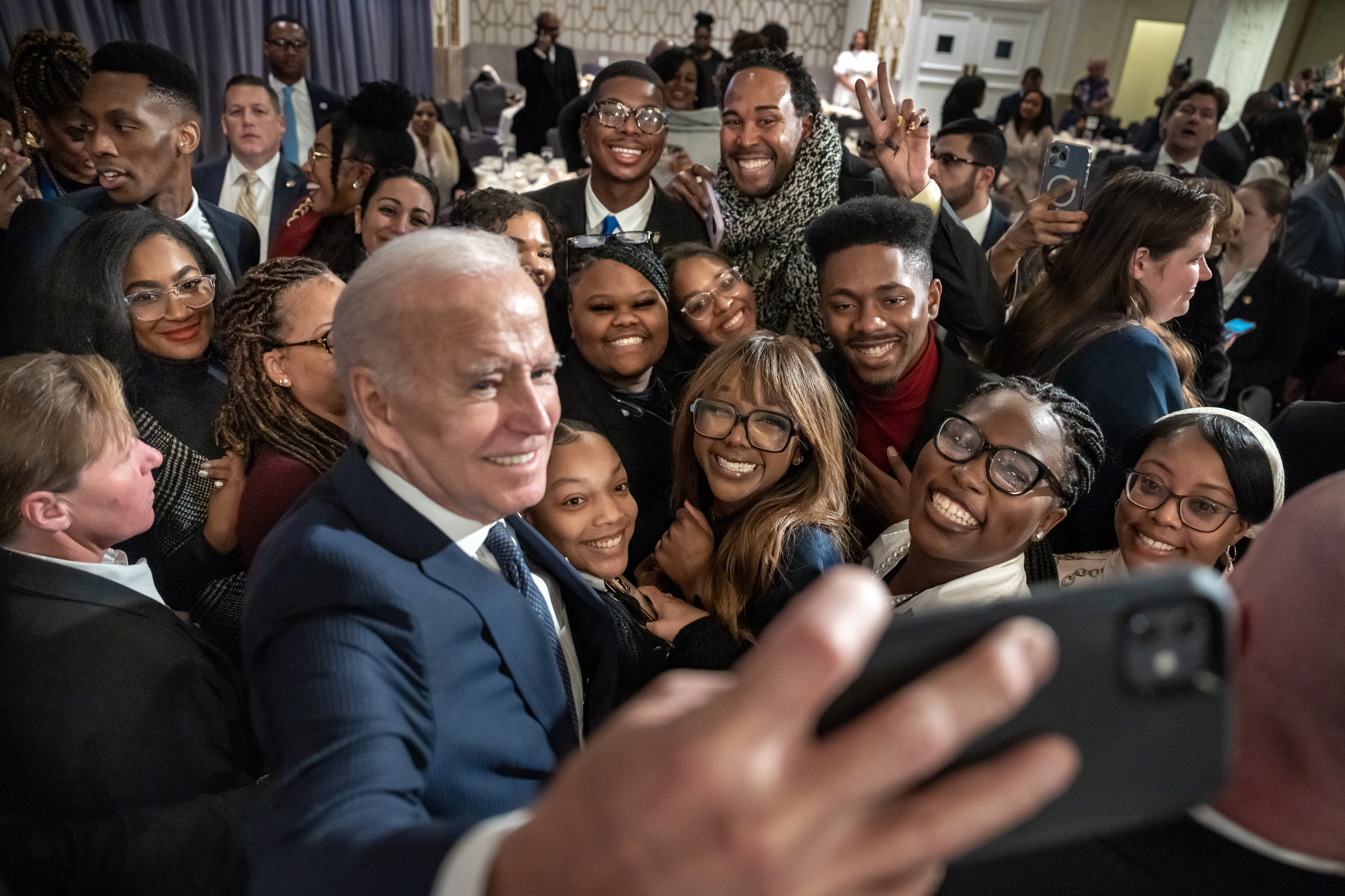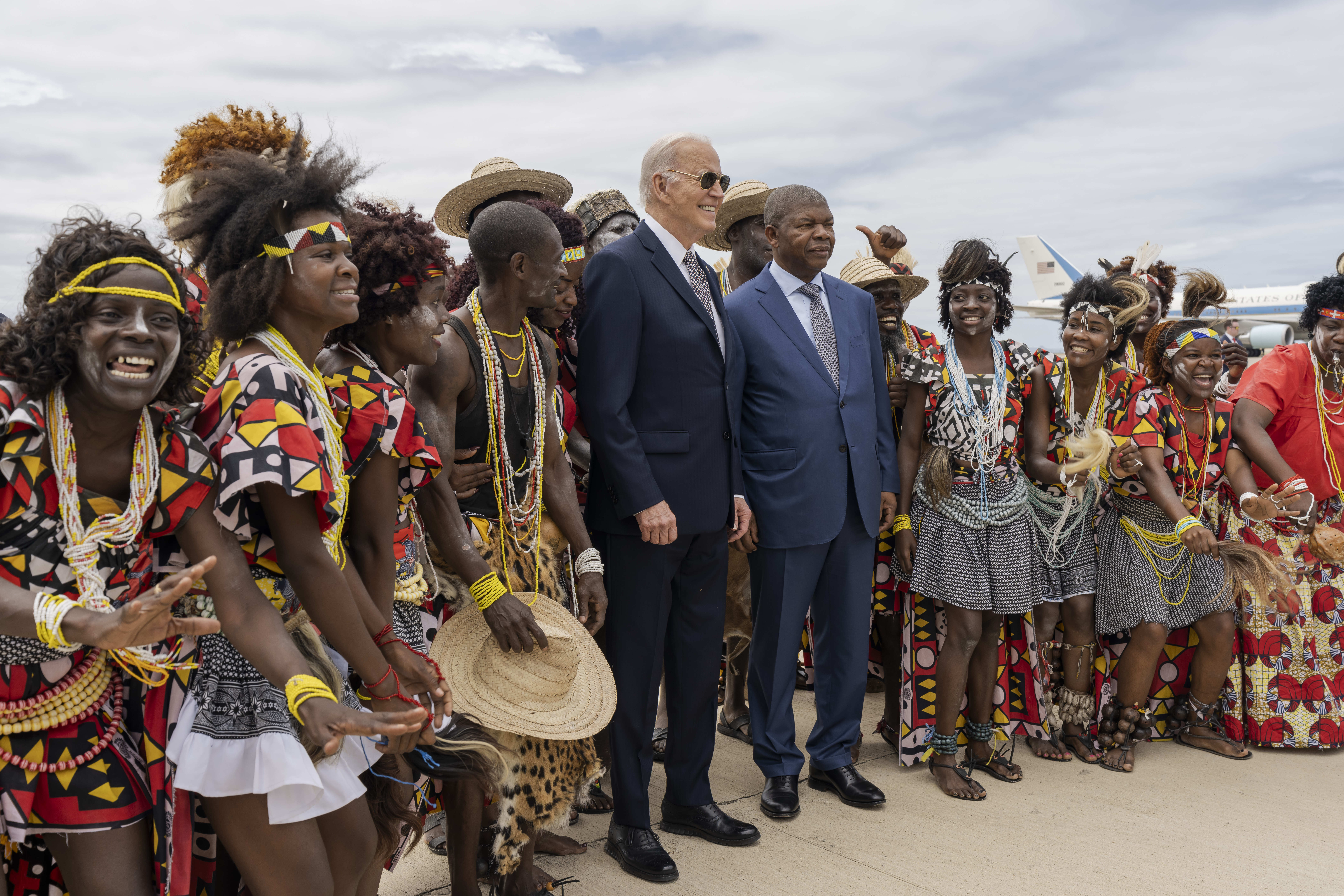 President Joe Biden and President João Lourenço of Angola pose for a photo with members of an Angolan dance group after the President’s arrival at Catumbela International Airport in Lobito, Angola.