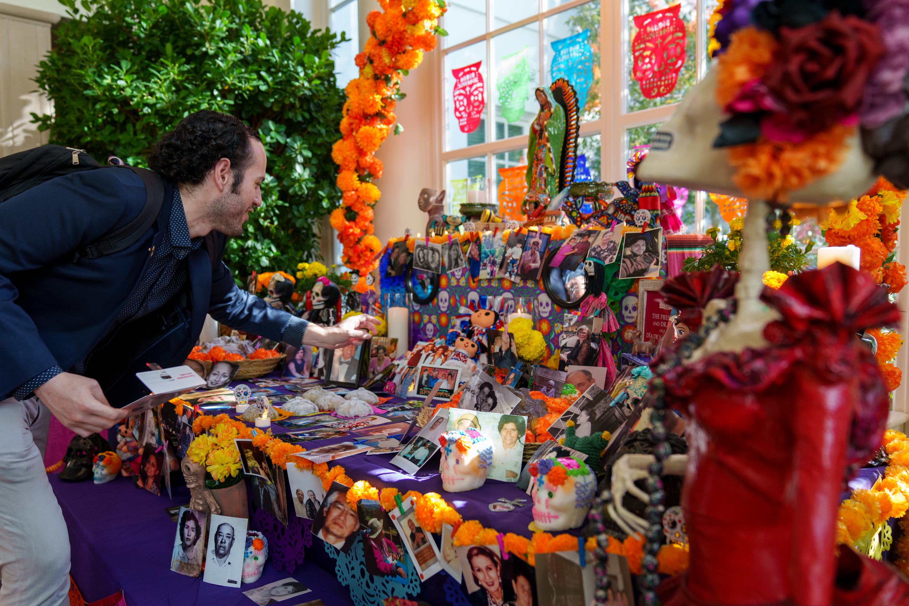 A guest places a photo of a loved one on the White House’s ofrenda to mark Día de los Muertos.