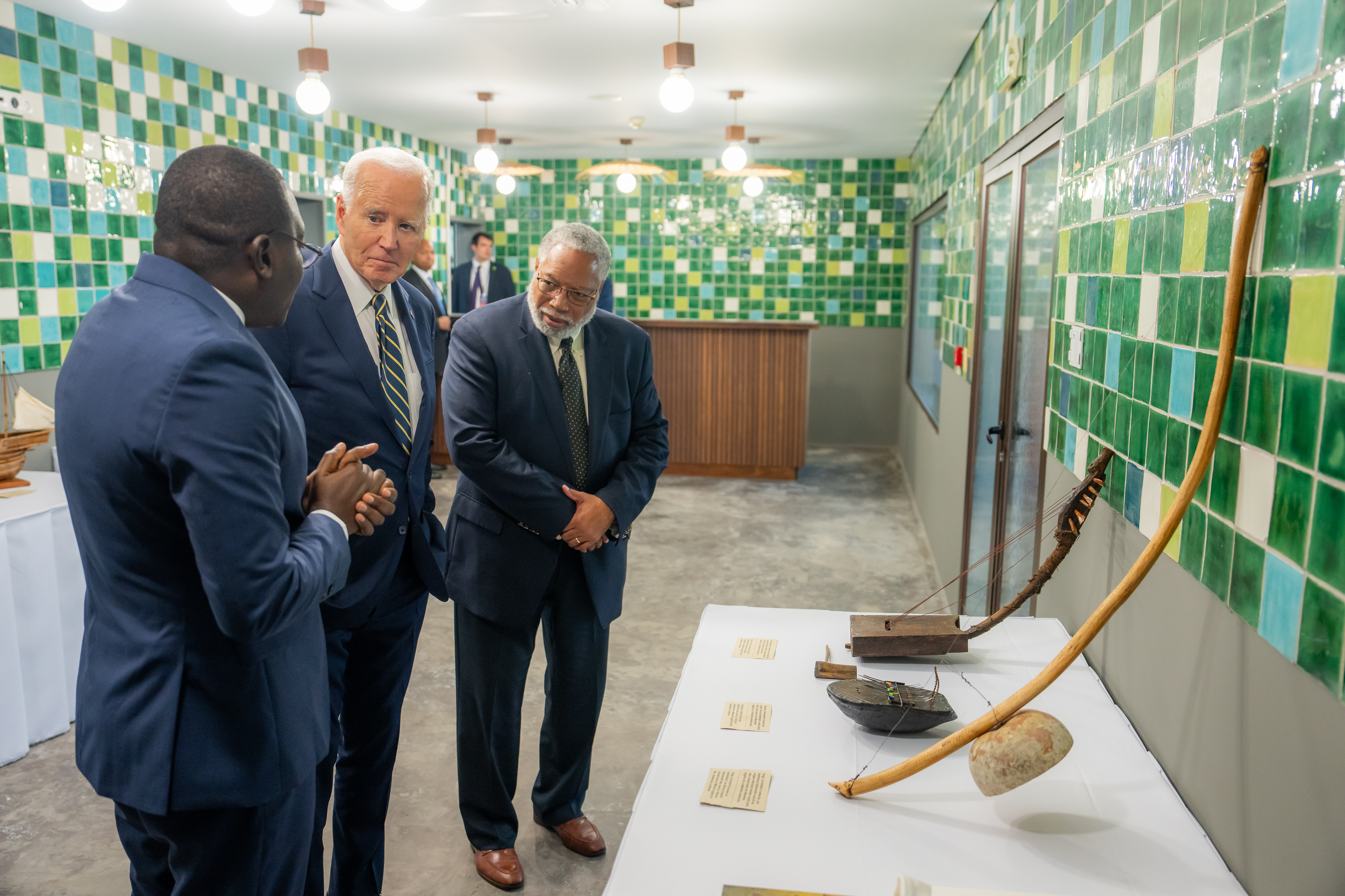President Joe Biden and Secretary of the Smithsonian Institution Lonnie Bunch, right, receive a briefing on artifacts in the National Museum of Slavery’s collection from Museum Director Jacinto “Vladimir” Teixeira Fortuna in Belas, Angola.