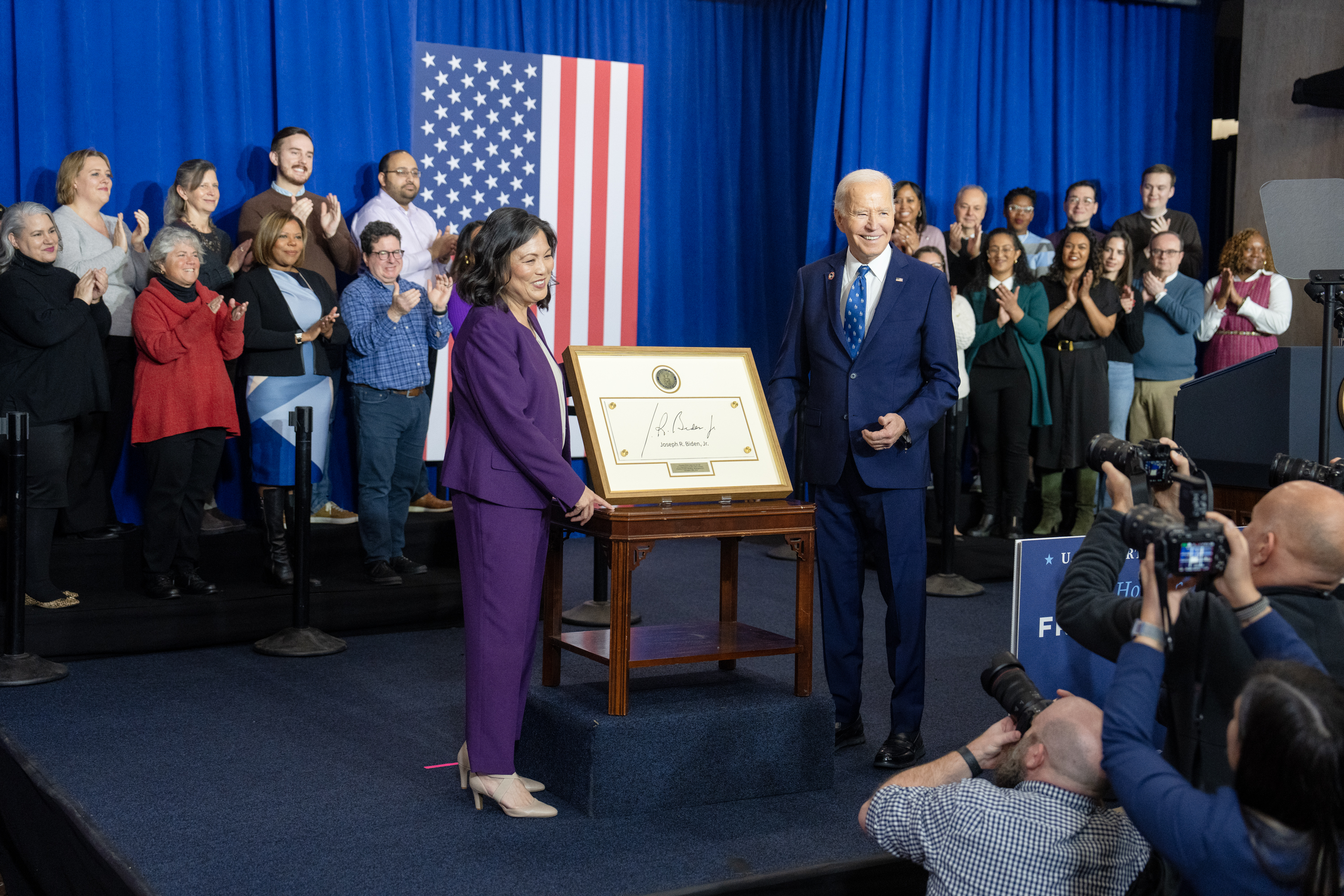 President Joe Biden receives the Hall of Honor award from Acting Secretary Julie Su at the Department of Labor.