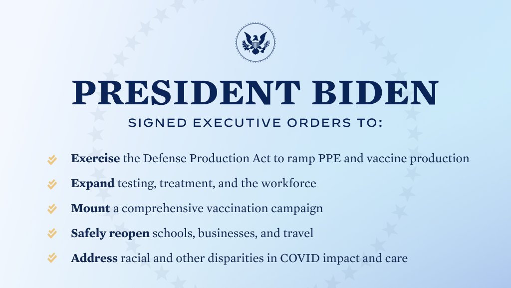 President Joe Biden signs Day One executive actions to tackle the COVID-19 pandemic, provide economic relief to Americans, rejoin the Paris Agreement, rejoin the World Health Organization, reverse discriminatory travel restrictions against Muslims, advance racial equity, and more.